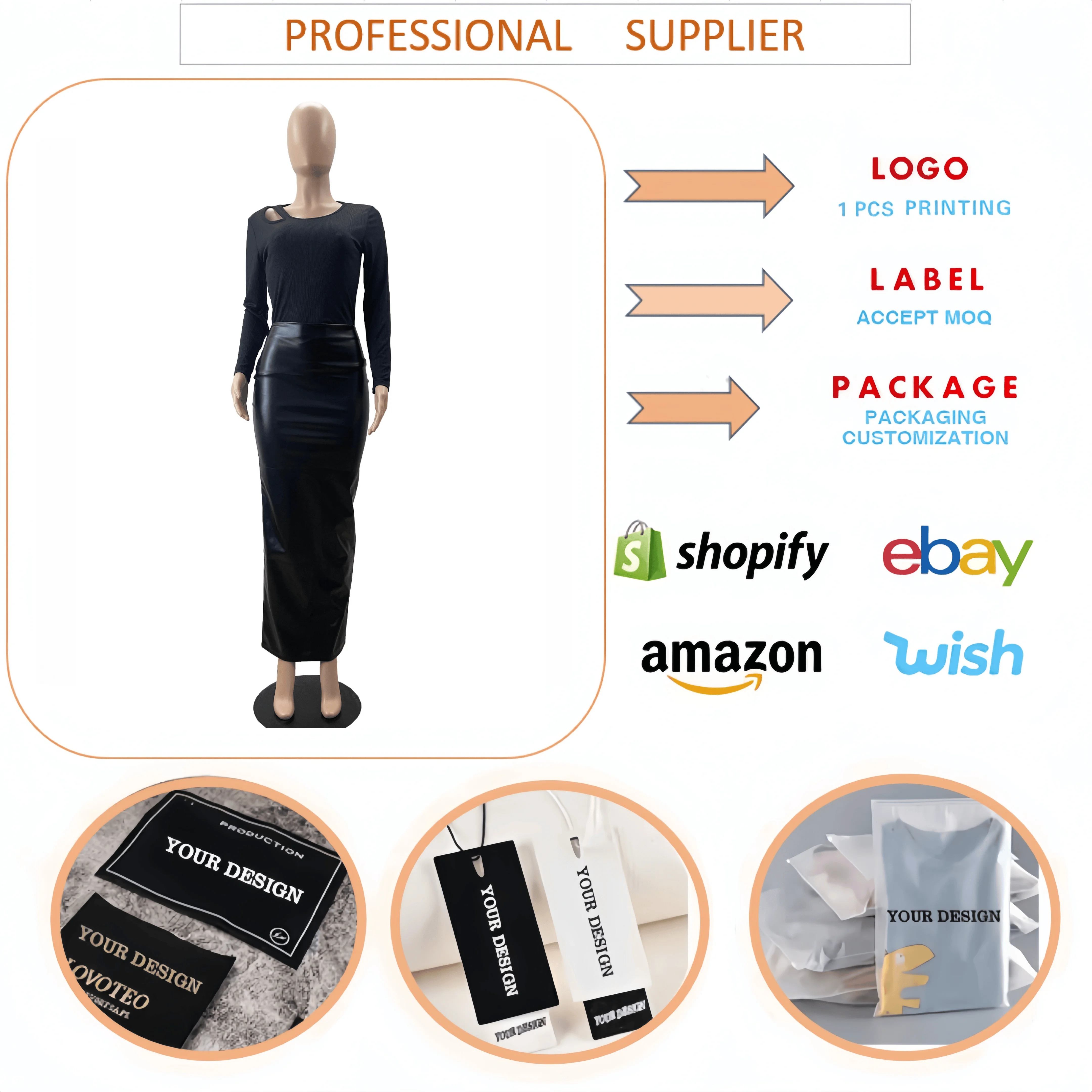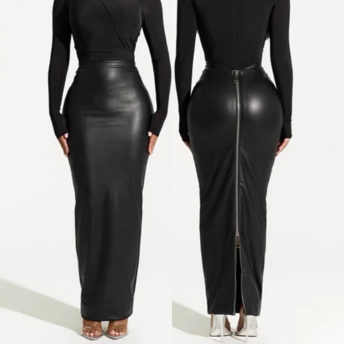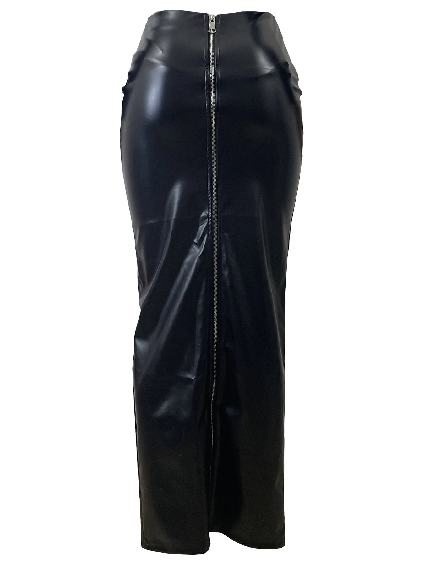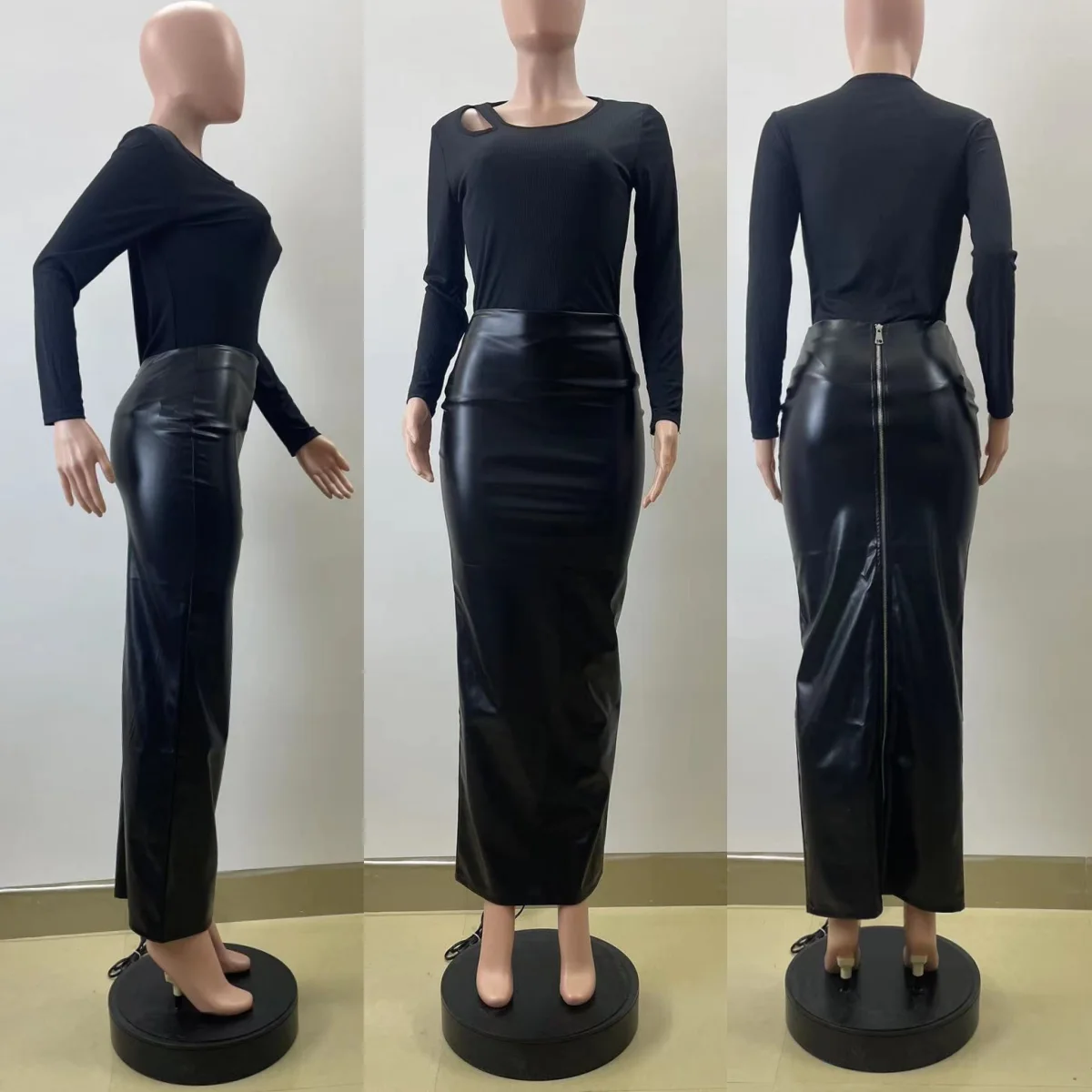 M6008 Women Long Skirts Women's Autumn Winter New Style Black Faux Leather Midi Skirt Bodycon Slim-Fitting with Zipper Design