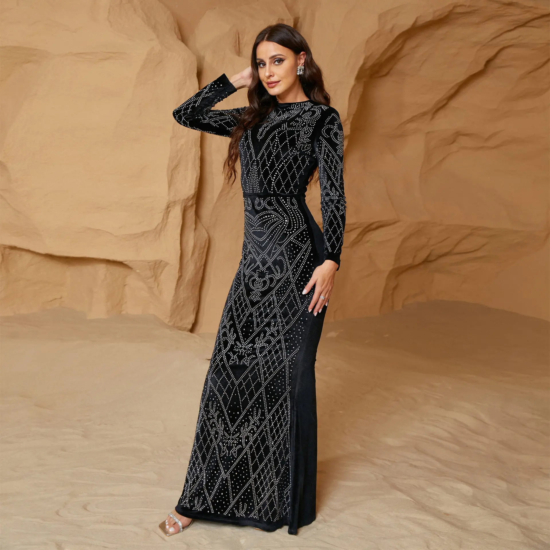ZYHT 21541 Wholesale Crew Neck High Waist Casual Dresses Elegant Lace Velvet Mermaid Hem Ruched Long Sleeve Dresses for Women