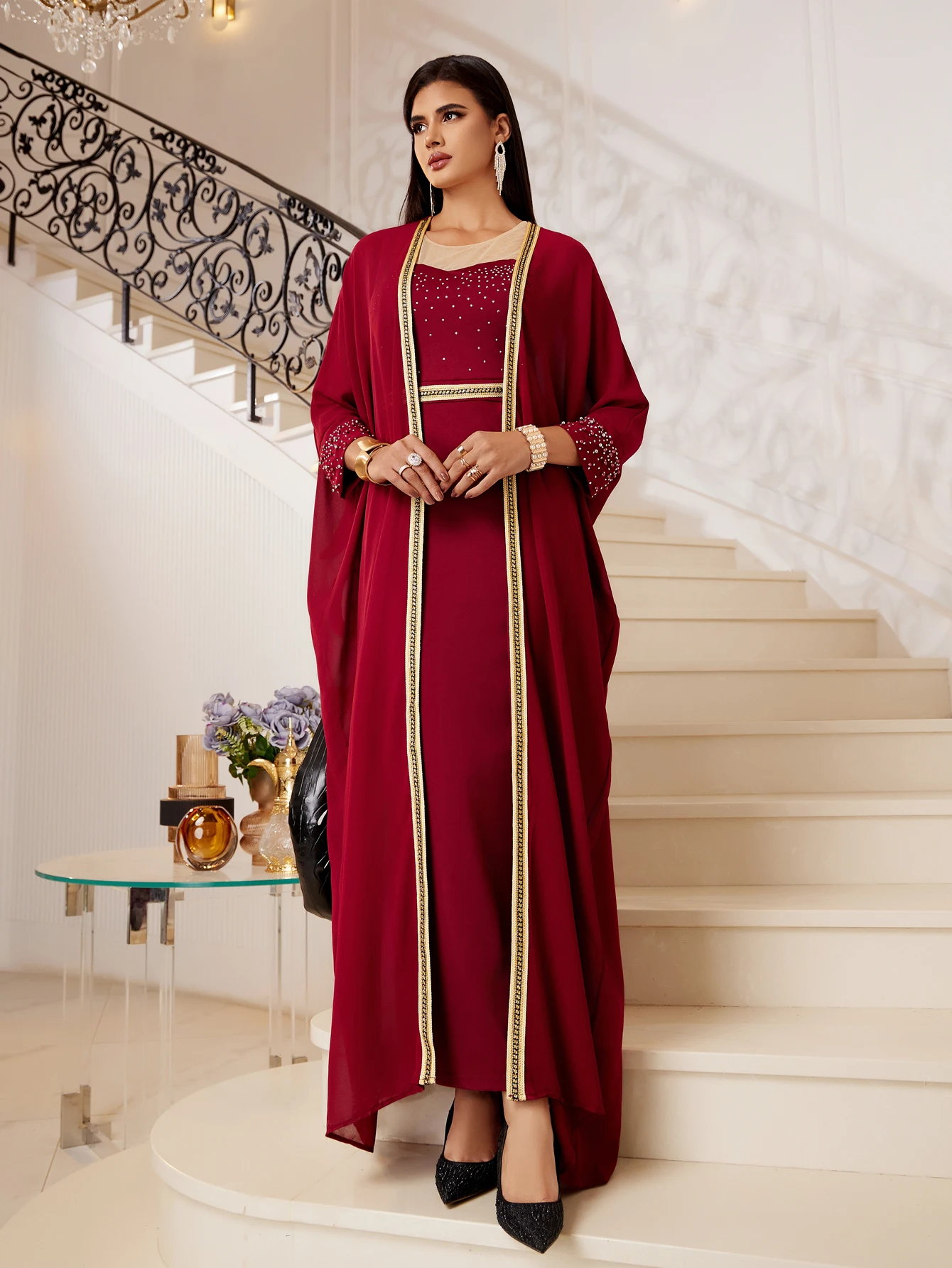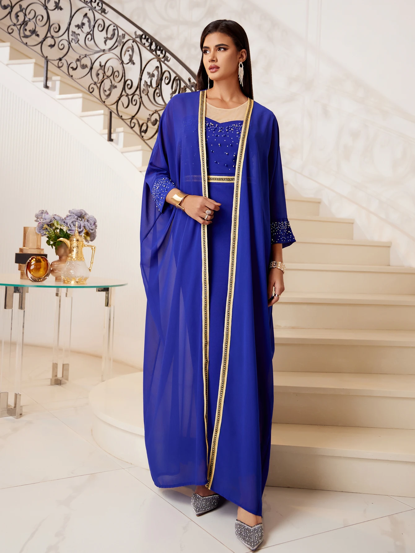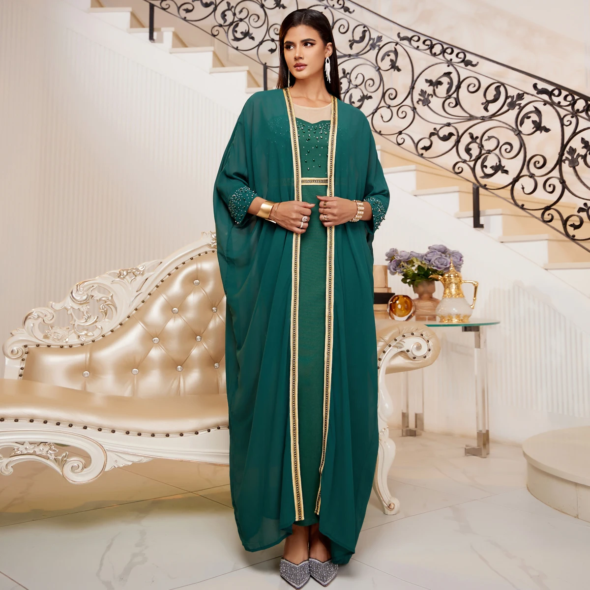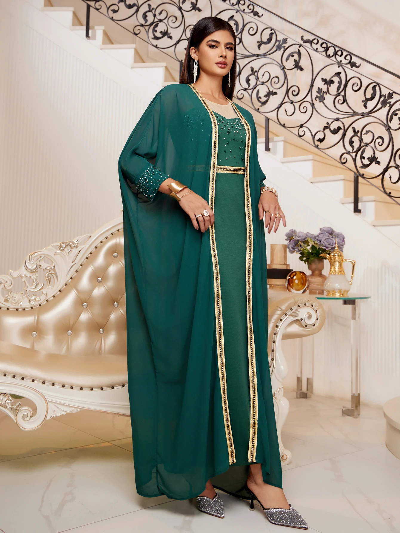 Middle East 4 Color Cross Border Muslim Abaya Women's Sequin Dress Set Cloak Kaftan Two Piece Dress
