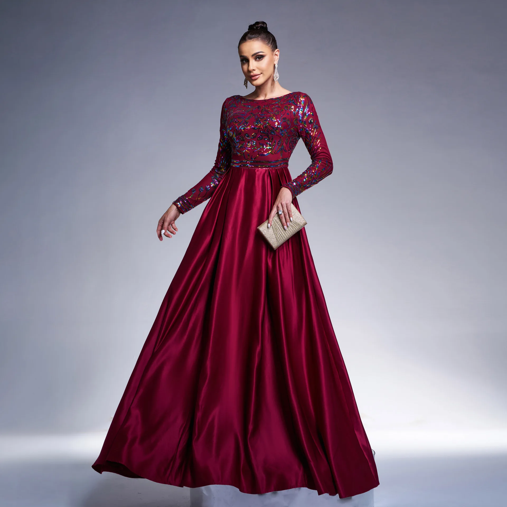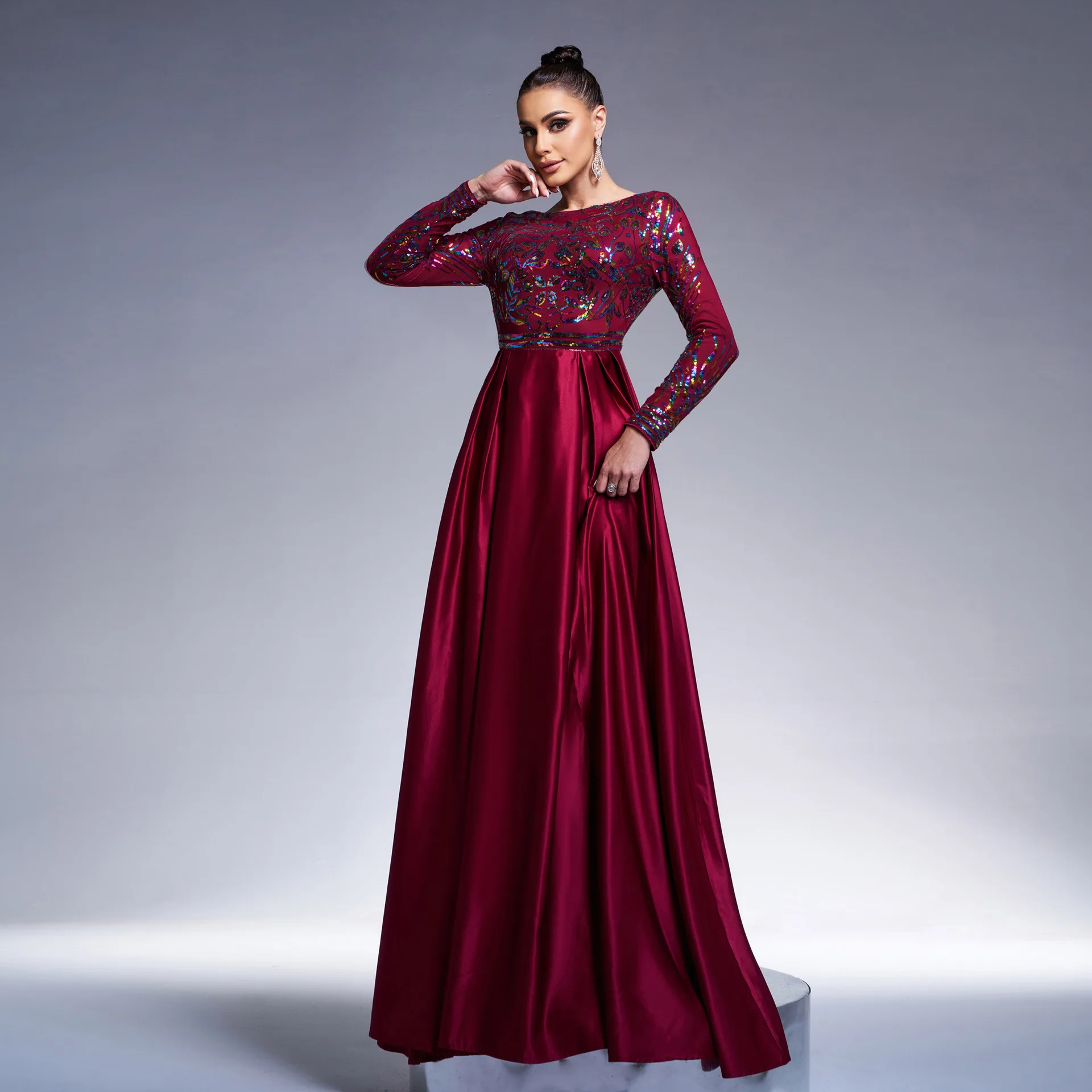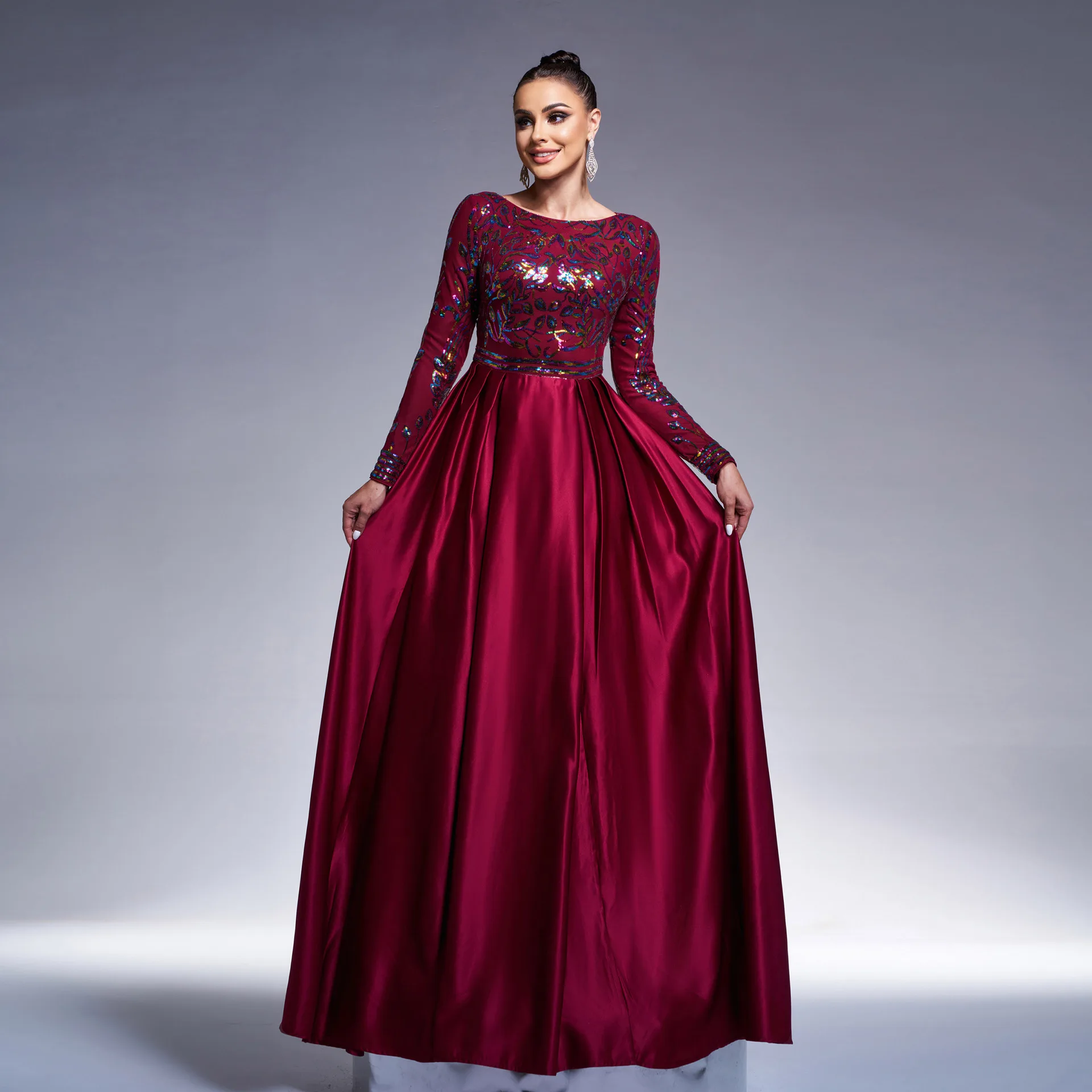 Formal O-Neck Long Sleeve A-Line Maxi Sequin Muslim Clothing Elegant Luxury Modest Women's Dresses Evening Party Wear