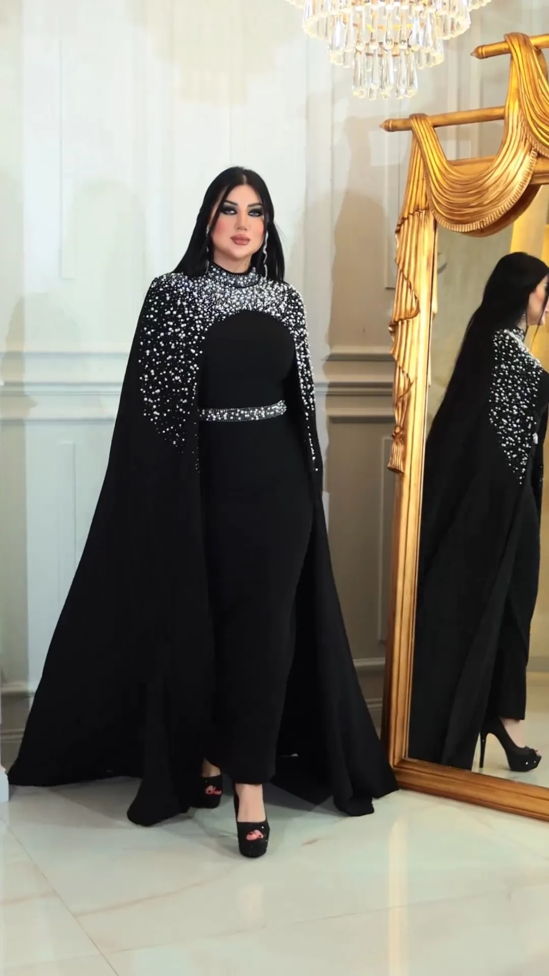 ZYHT 21938 Black Velvet Mini Dress Square Neck Long Puff Sleeves with Pearl Trim & Crystal Dess Flared Scalloped Hem Dresses