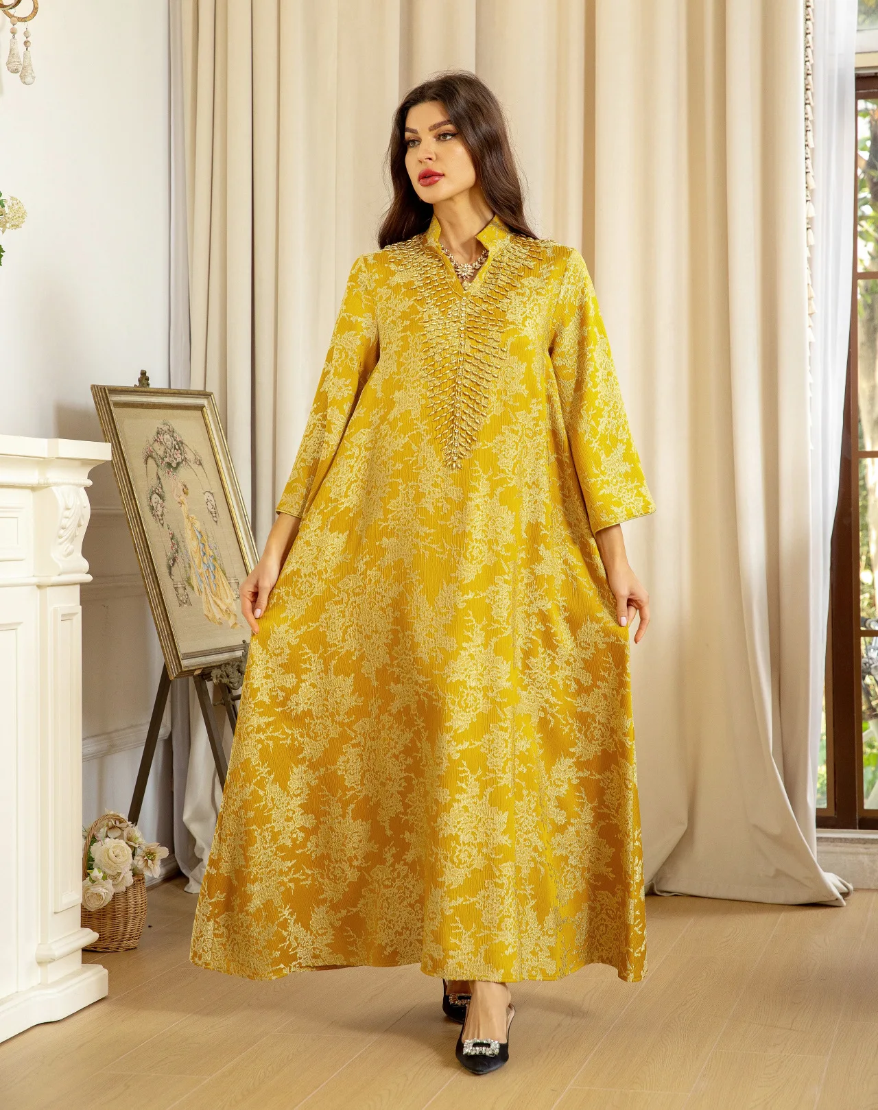 ZYHT 73571 Custom Elegant V-Neck Cape Sleeve Dresses Trendy Straight Yellow Maxi Party Gowns Modest Evening Dress for Women