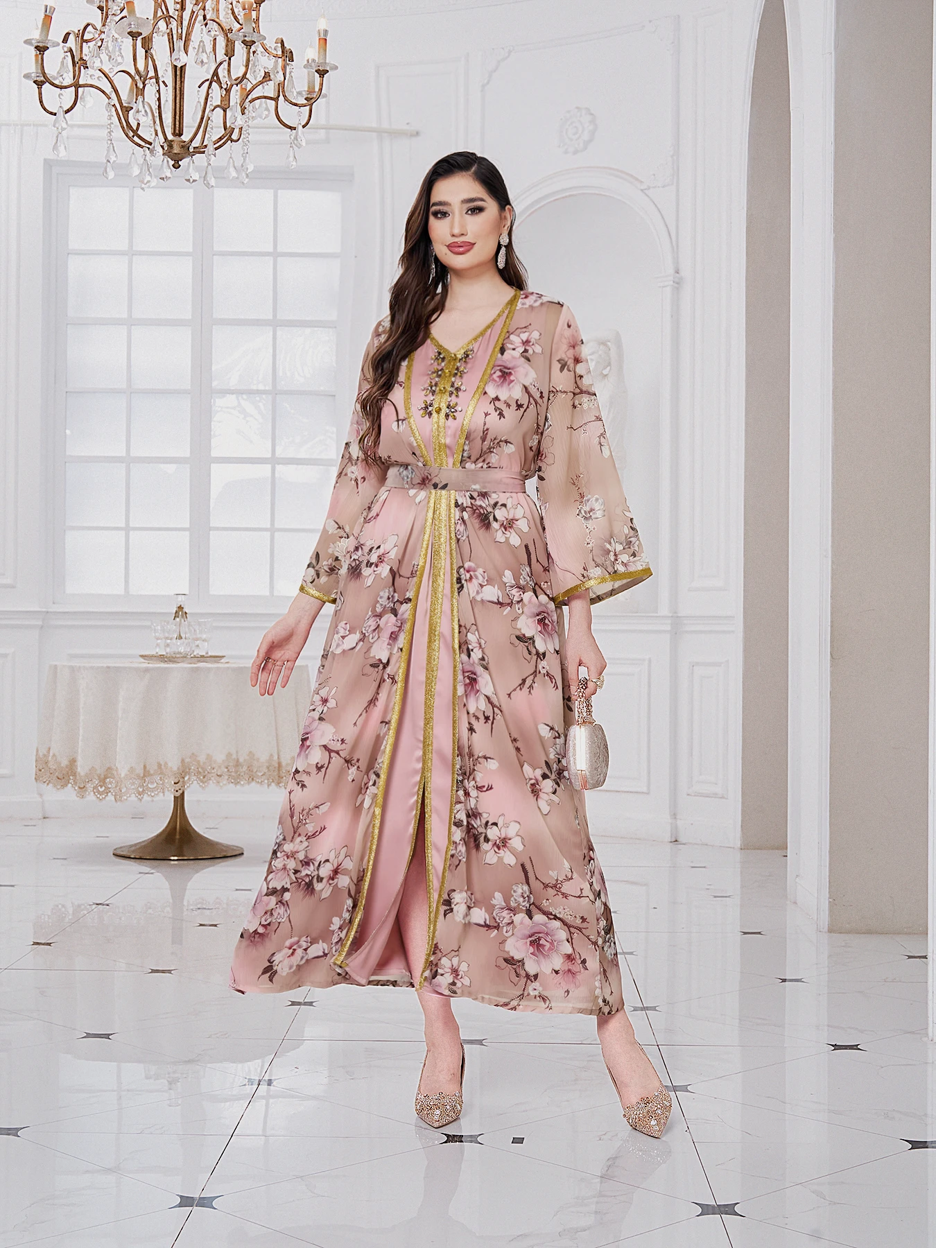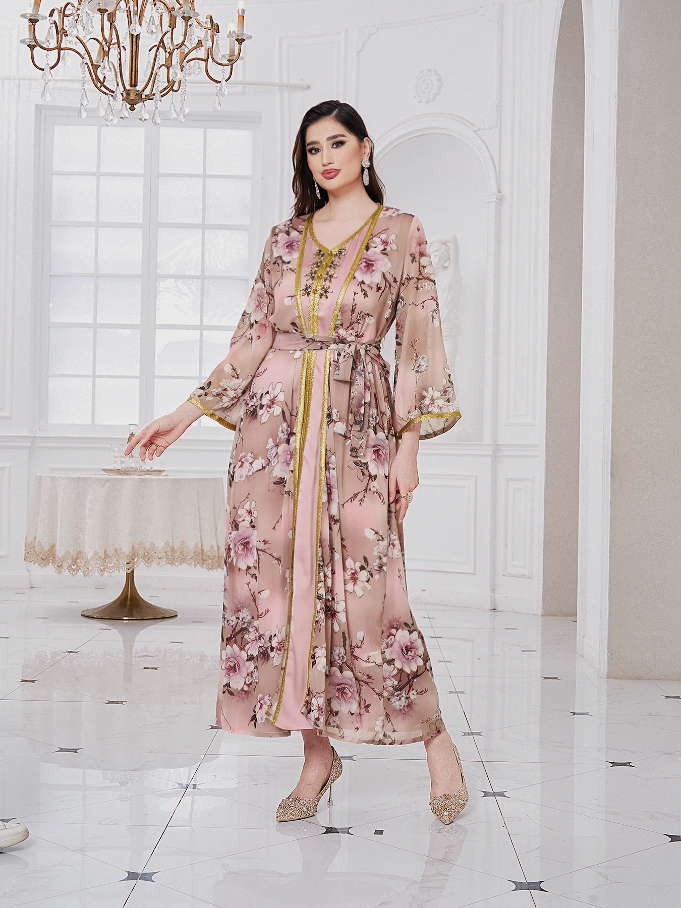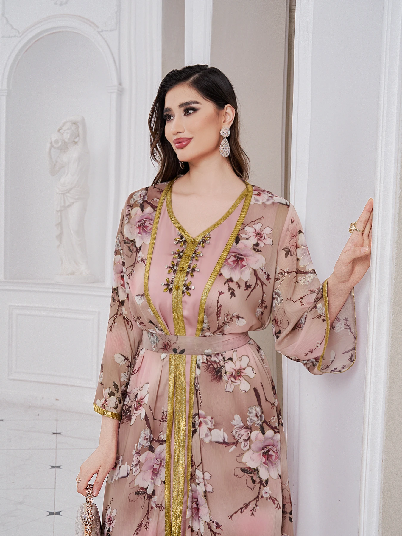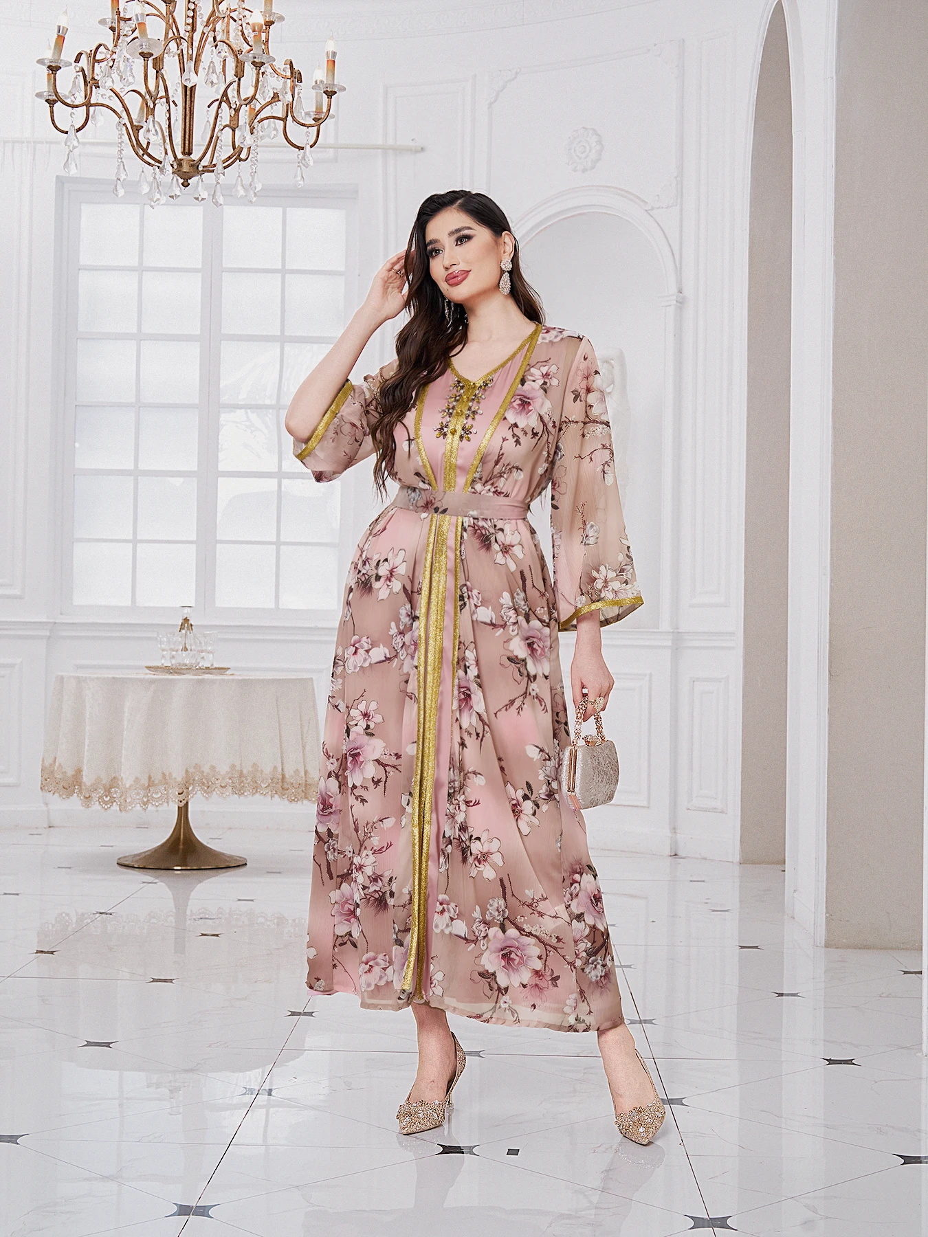 Modest Turkey Muslim Fashion Floral pink Abaya Dubai Kaftan for EID Ramadan