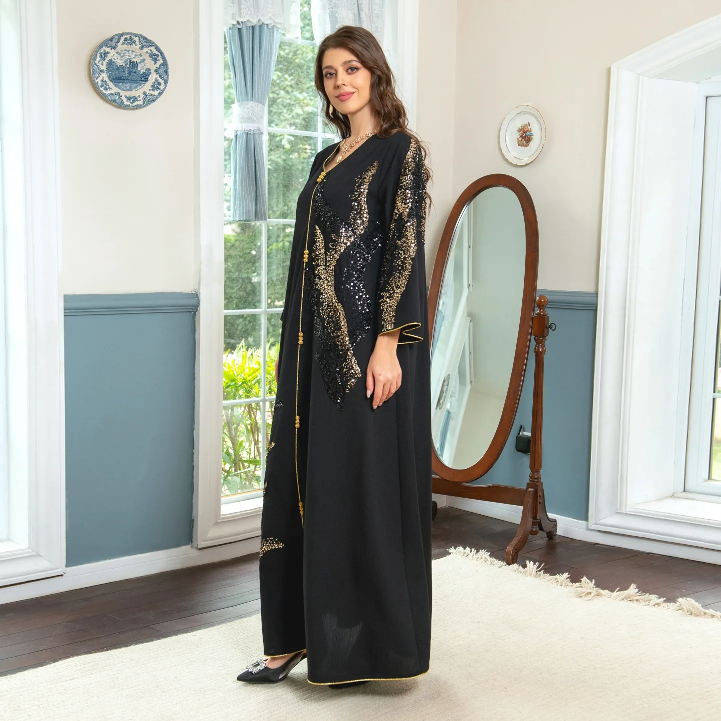 Dubai Abaya Wholesale Turkey Black Loose Style V-neck Long Sleeve Maxi Dress Islamic Clothing Women Abaya Dubai Islamic Clothing