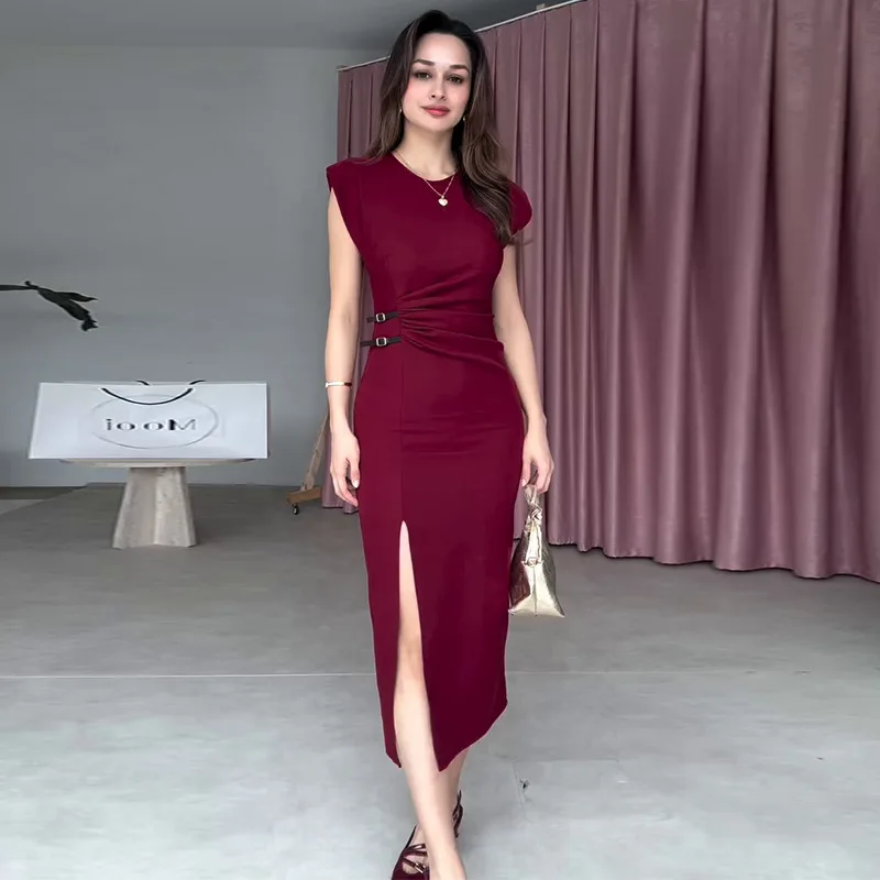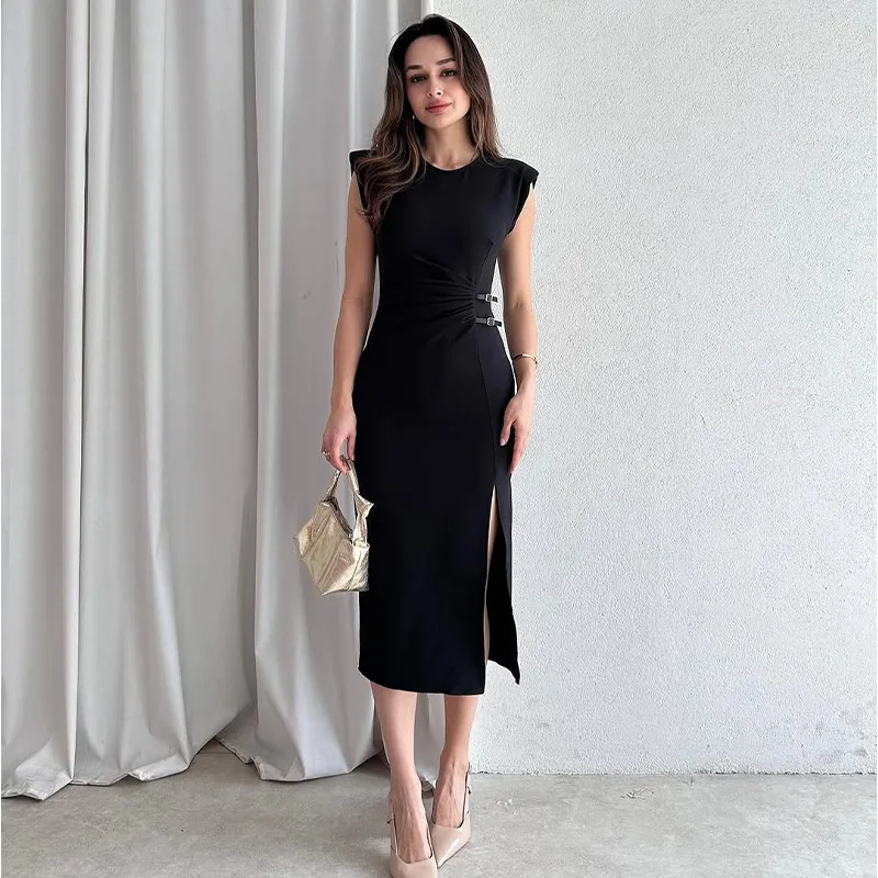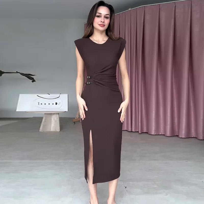 Wholesale 2026 summer new fashion elegant temperament round neck sleeveless side split simple pleated women's dress