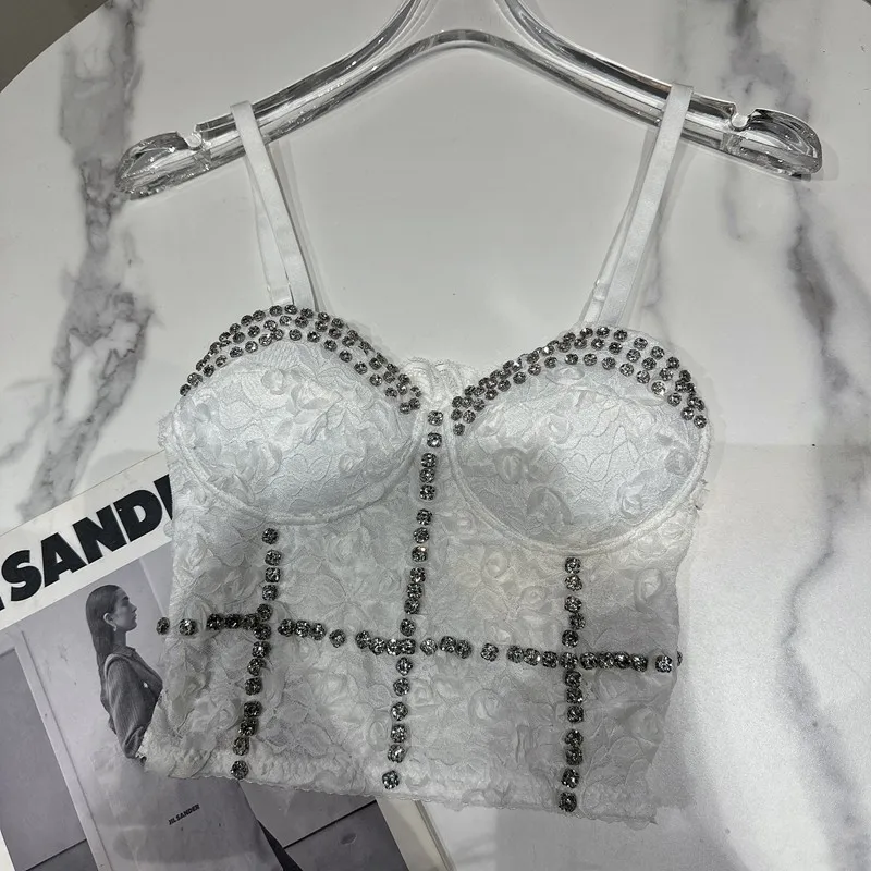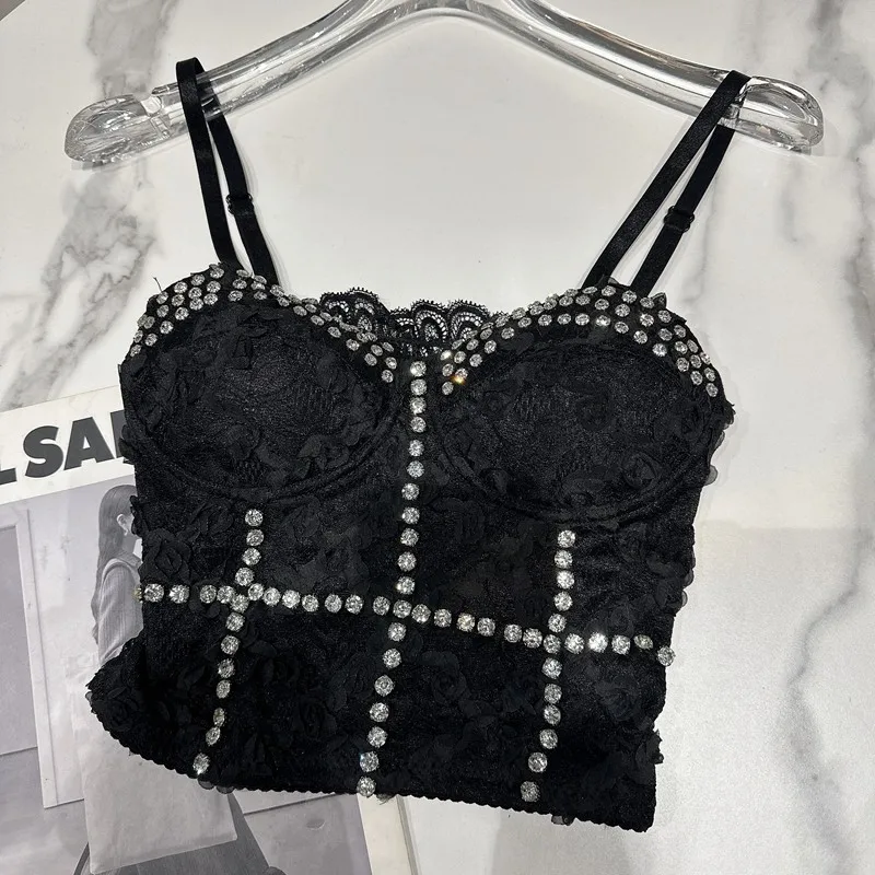 Wholesale Spring 2026 New Fashion Sexy Celebrity Large Granular Rhinestone Lace Chest Pad Suspender Women's Vest