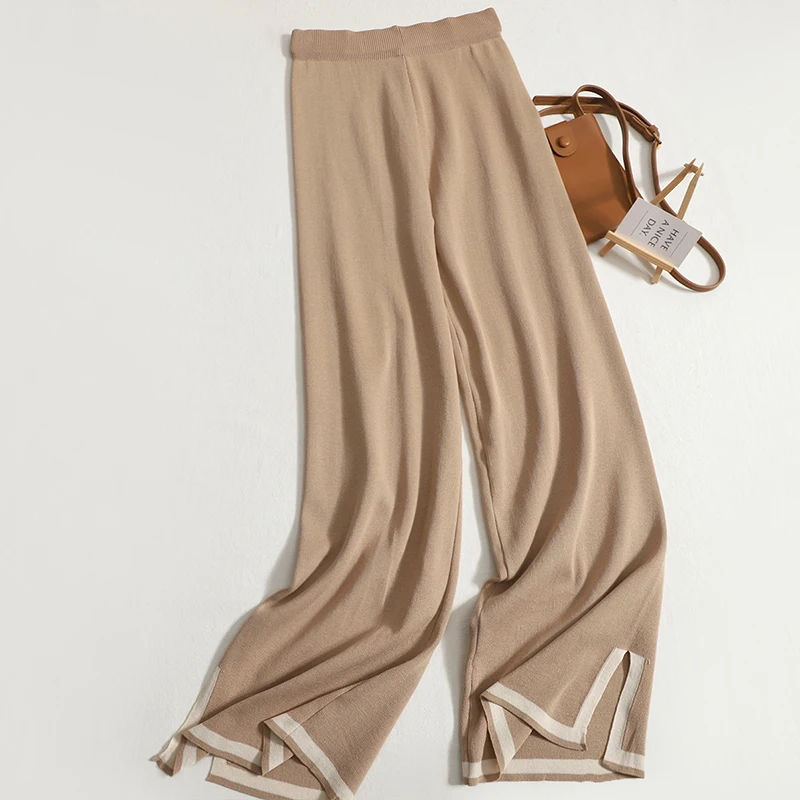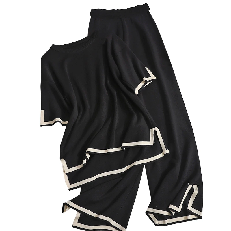 Wholesale 2023 Spring New Fashion Color Contrast Split Short Sleeve Knitwear High Waist Thin Wide Leg Trousers Women's Suit