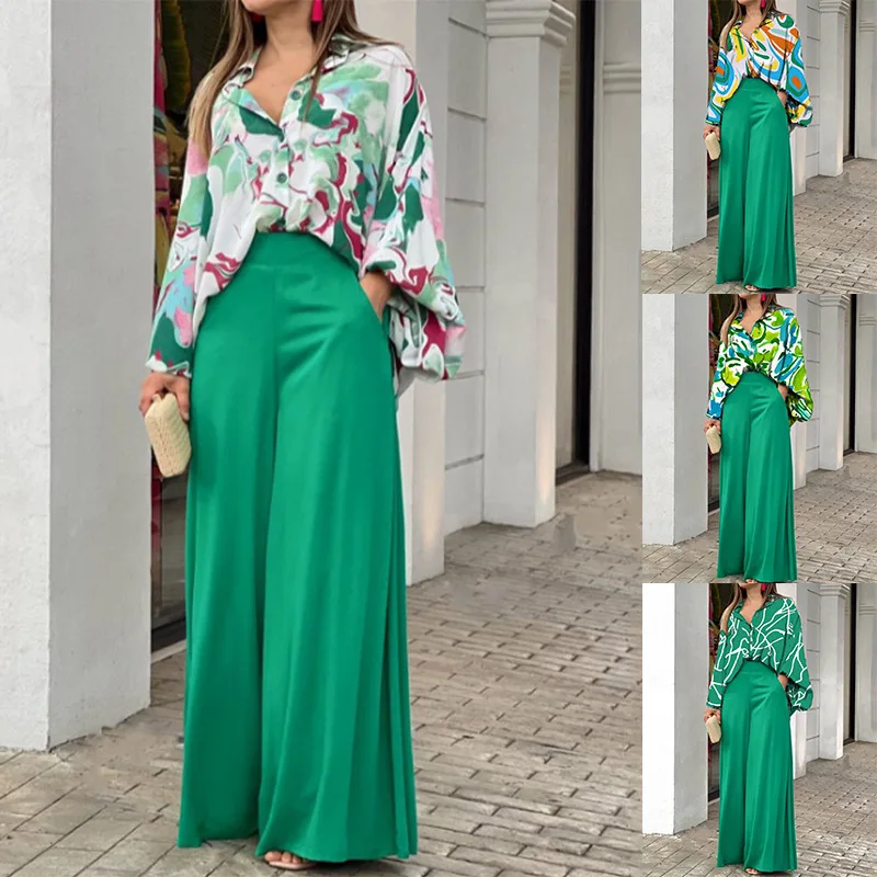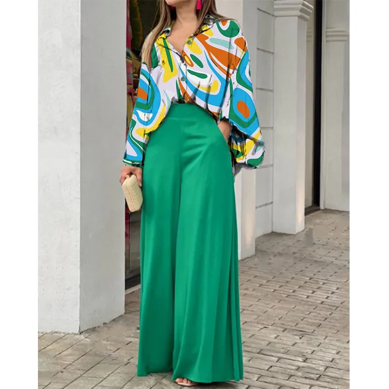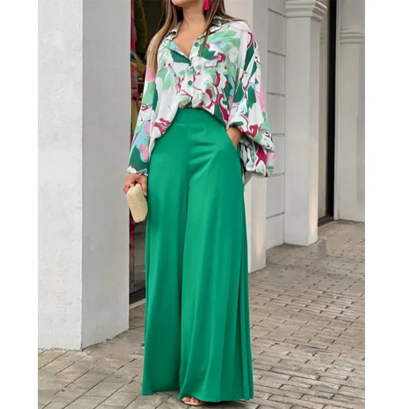 Wholesale 2022 Autumn Printed Casual Suits Loose Large Size Lapel Shirts High Waist Wide Leg Pants Women's Sets