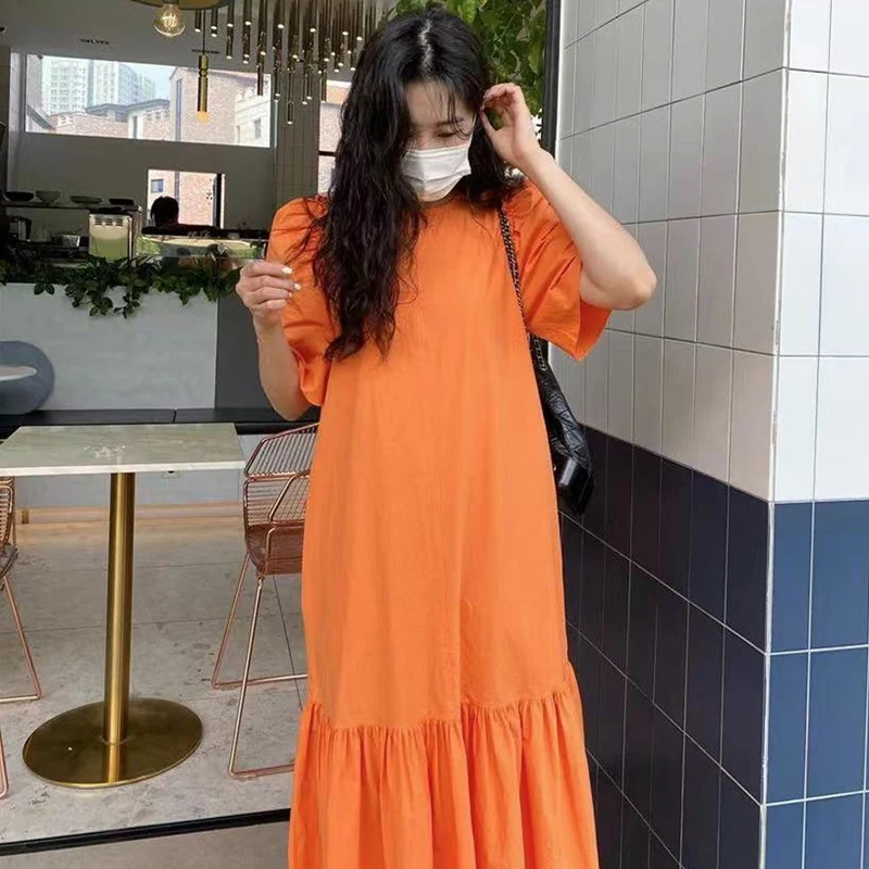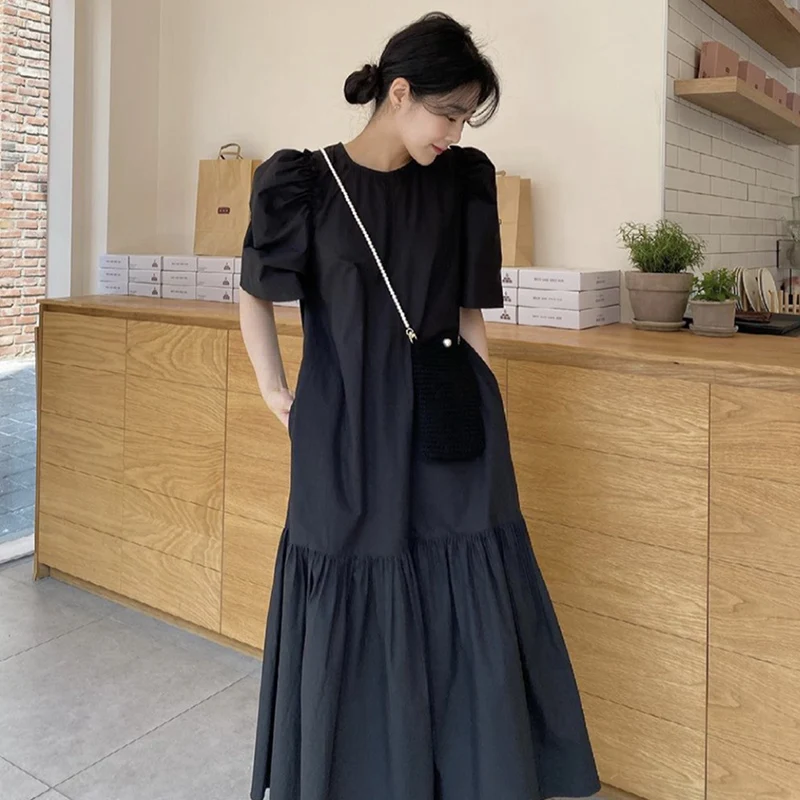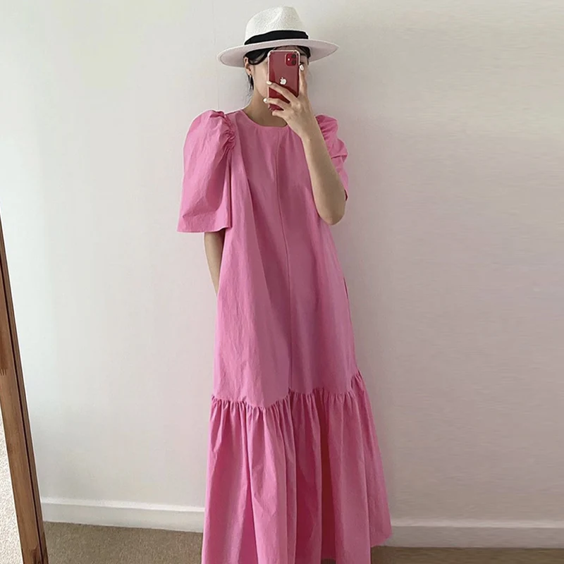 Boutique Wholesale Summer 2026 New Fashion Casual Round Neck Korean Style Puff Sleeves Solid Color Ruffled Cotton Women's Dress