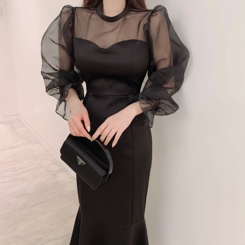 ZYHT 21541 Wholesale Crew Neck High Waist Casual Dresses Elegant Lace Velvet Mermaid Hem Ruched Long Sleeve Dresses for Women