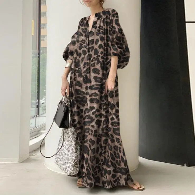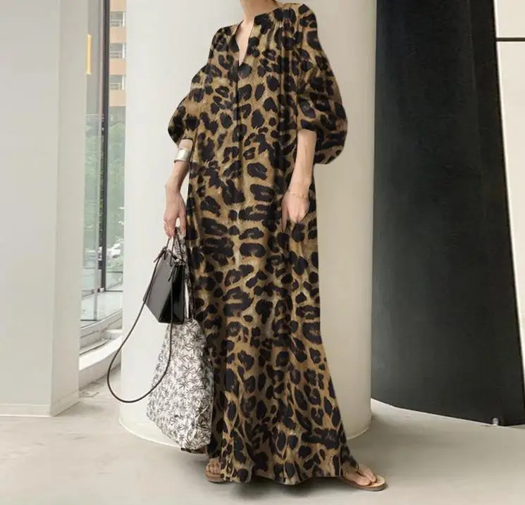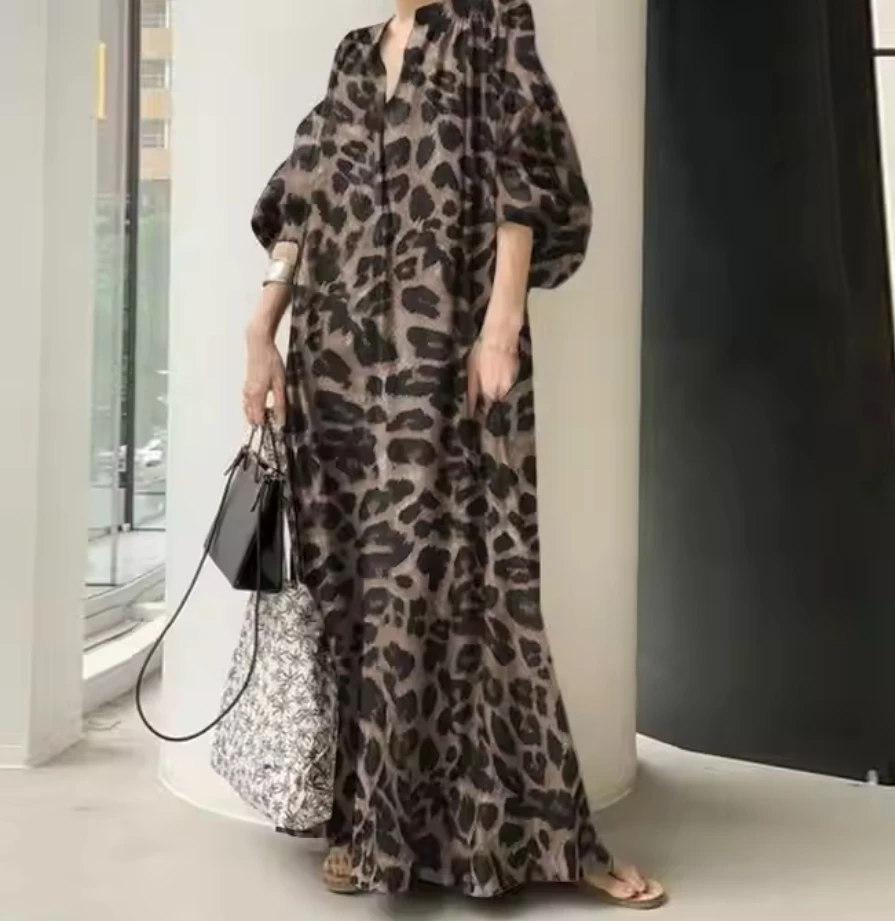 Wholesale 2026 Spring New Temperament Leopard Print Stand Collar Puff Sleeves Fashion Cotton Casual Bohemian Women's Dress