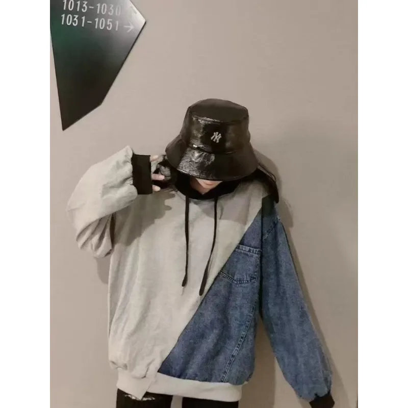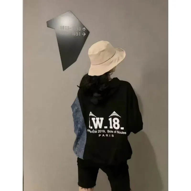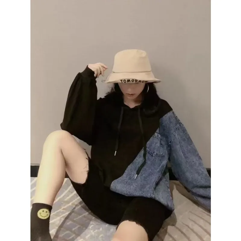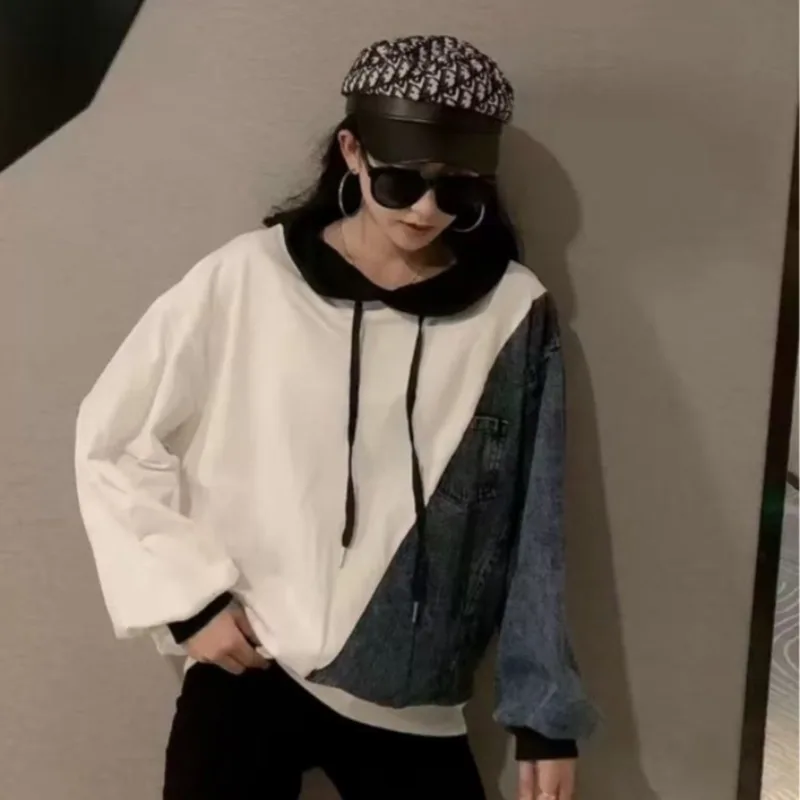 Wholesale autumn 2026 new fashion casual denim splicing sweater women's loose Hong Kong style hooded women'shoodies