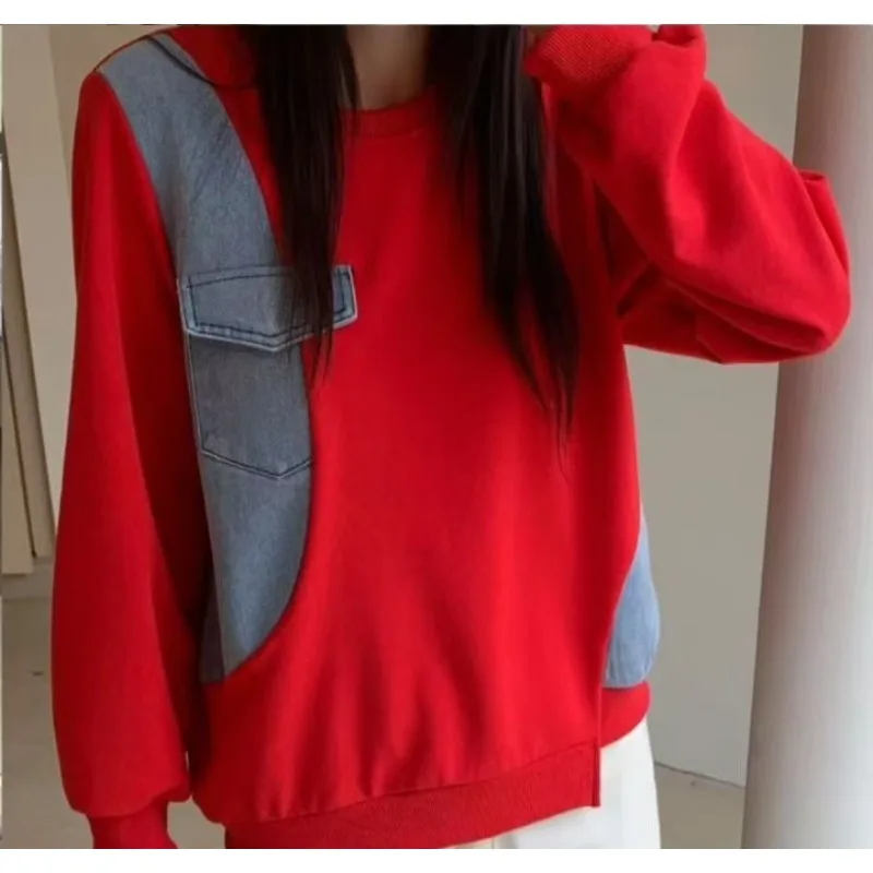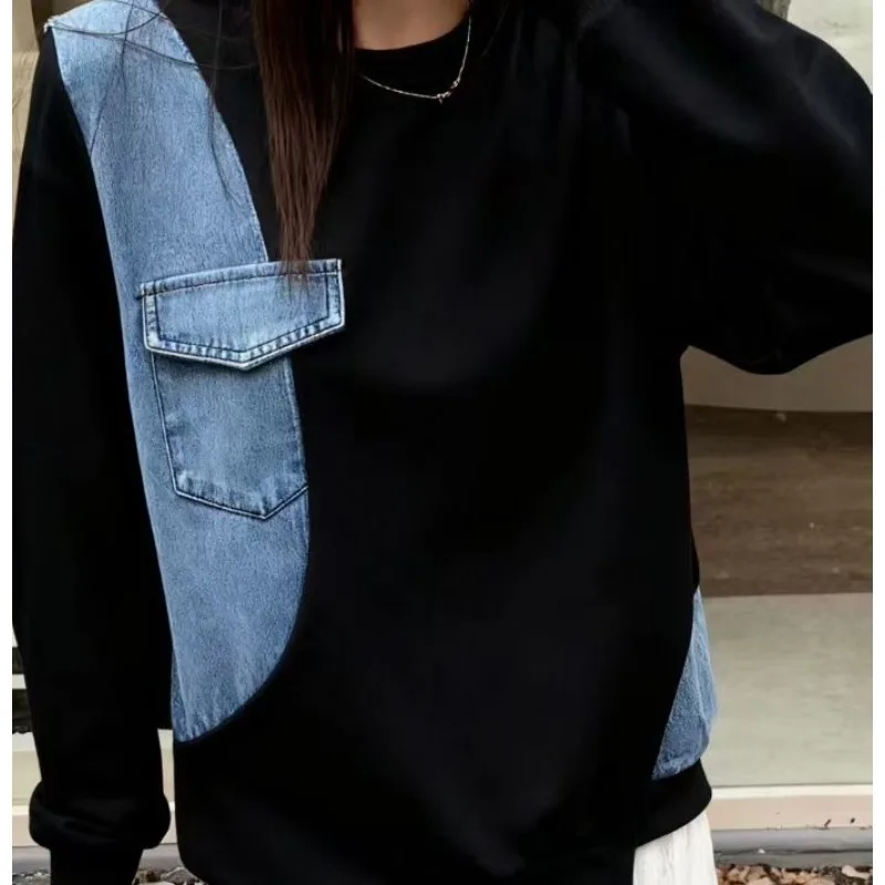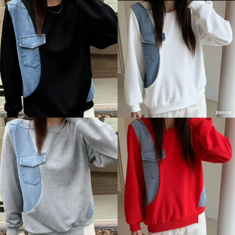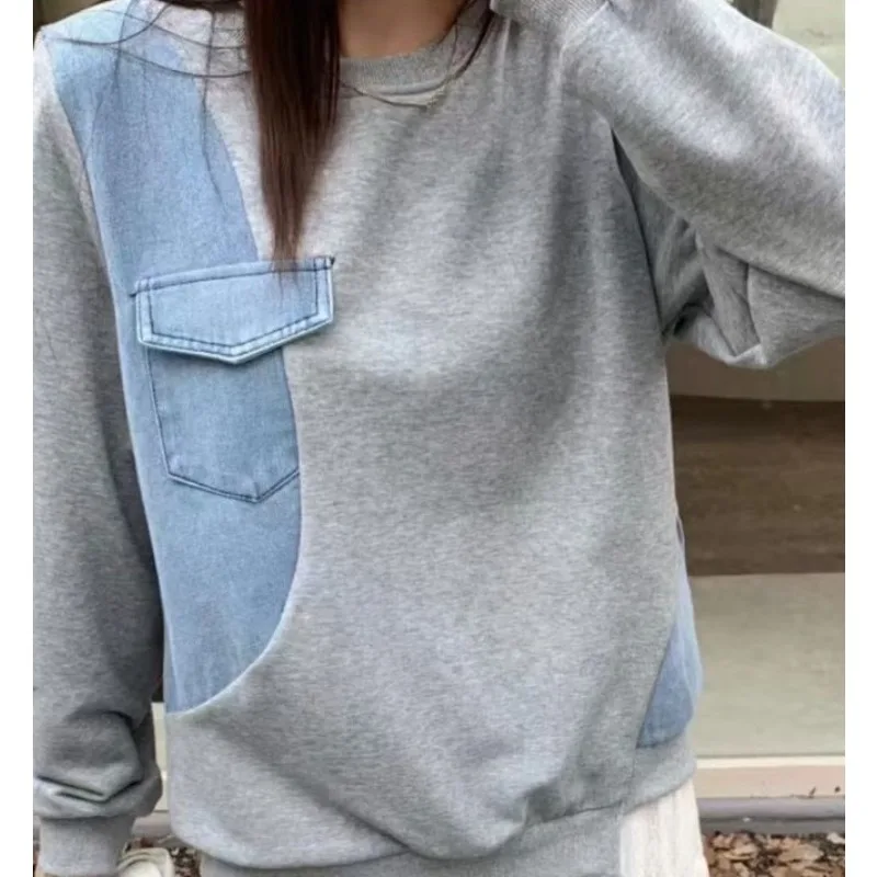 Wholesale autumn 2026 new fashion casual denim splicing sweater women's loose Hong Kong style round neck women's Hoodies