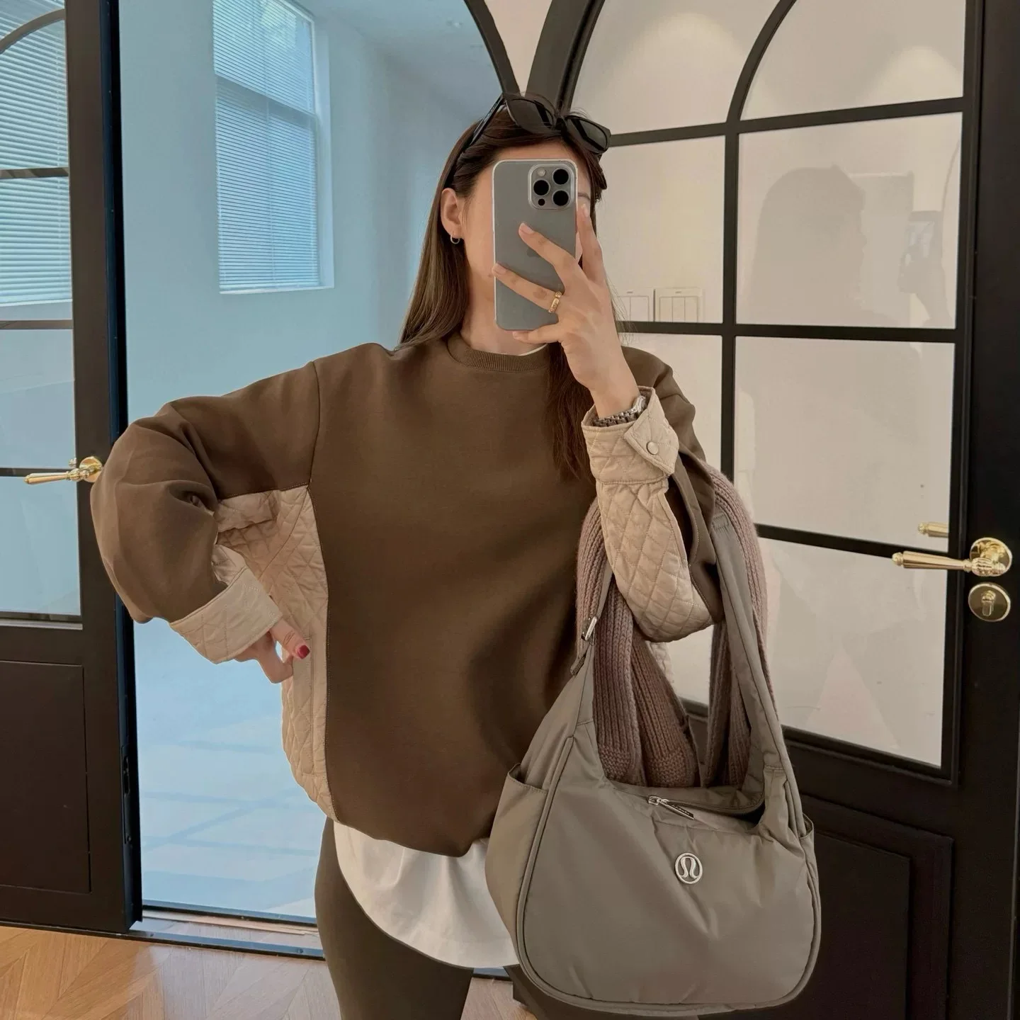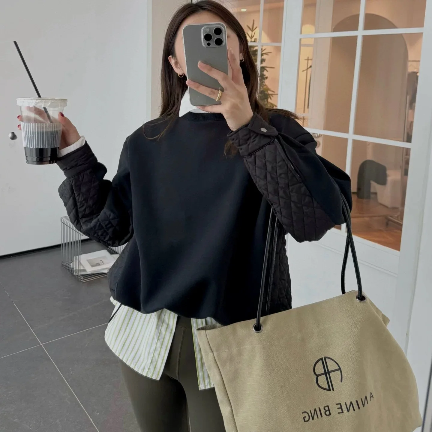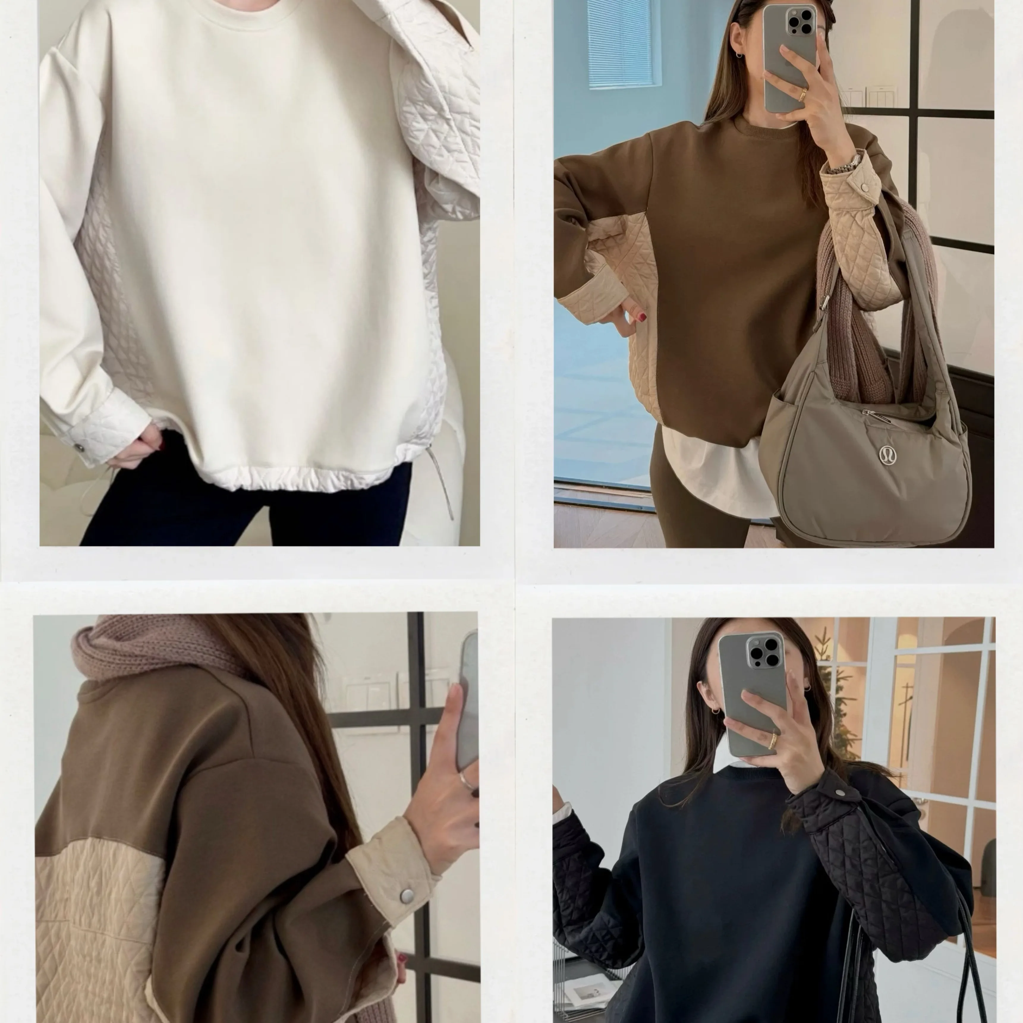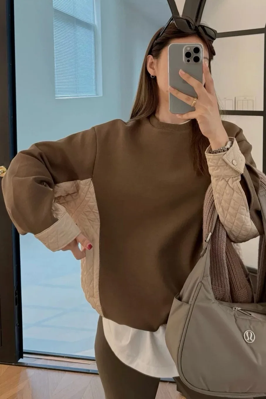 Wholesale autumn 2026 new fashion casual retro pullover top splicing padded cotton warm long sleeve crew neck women sweater