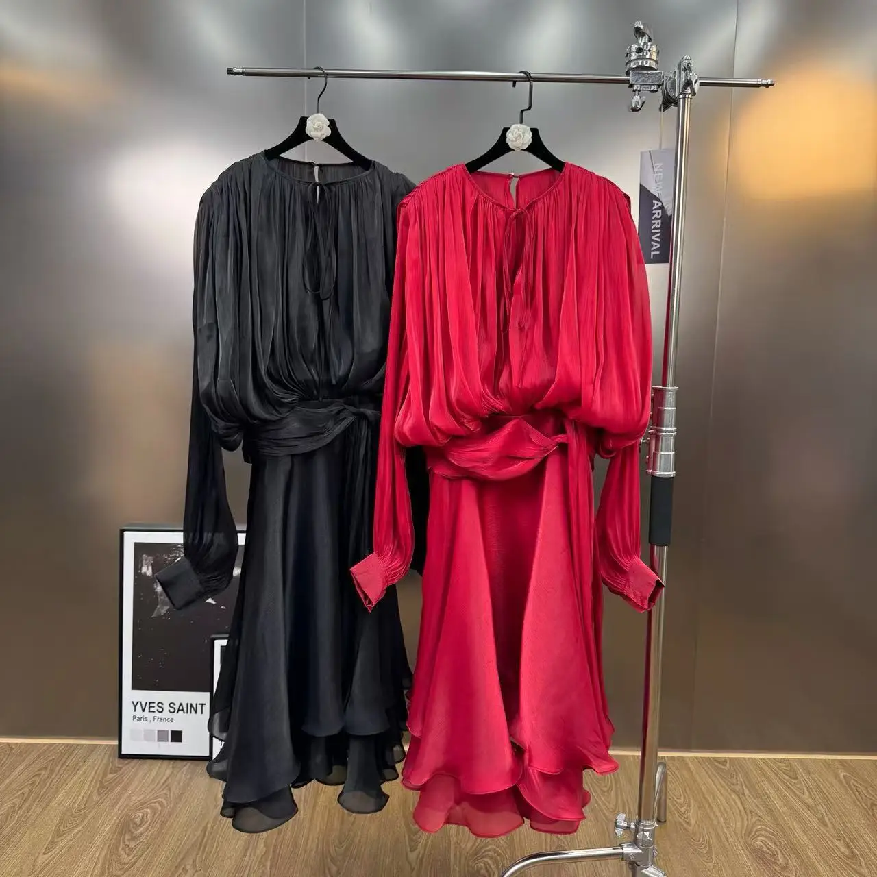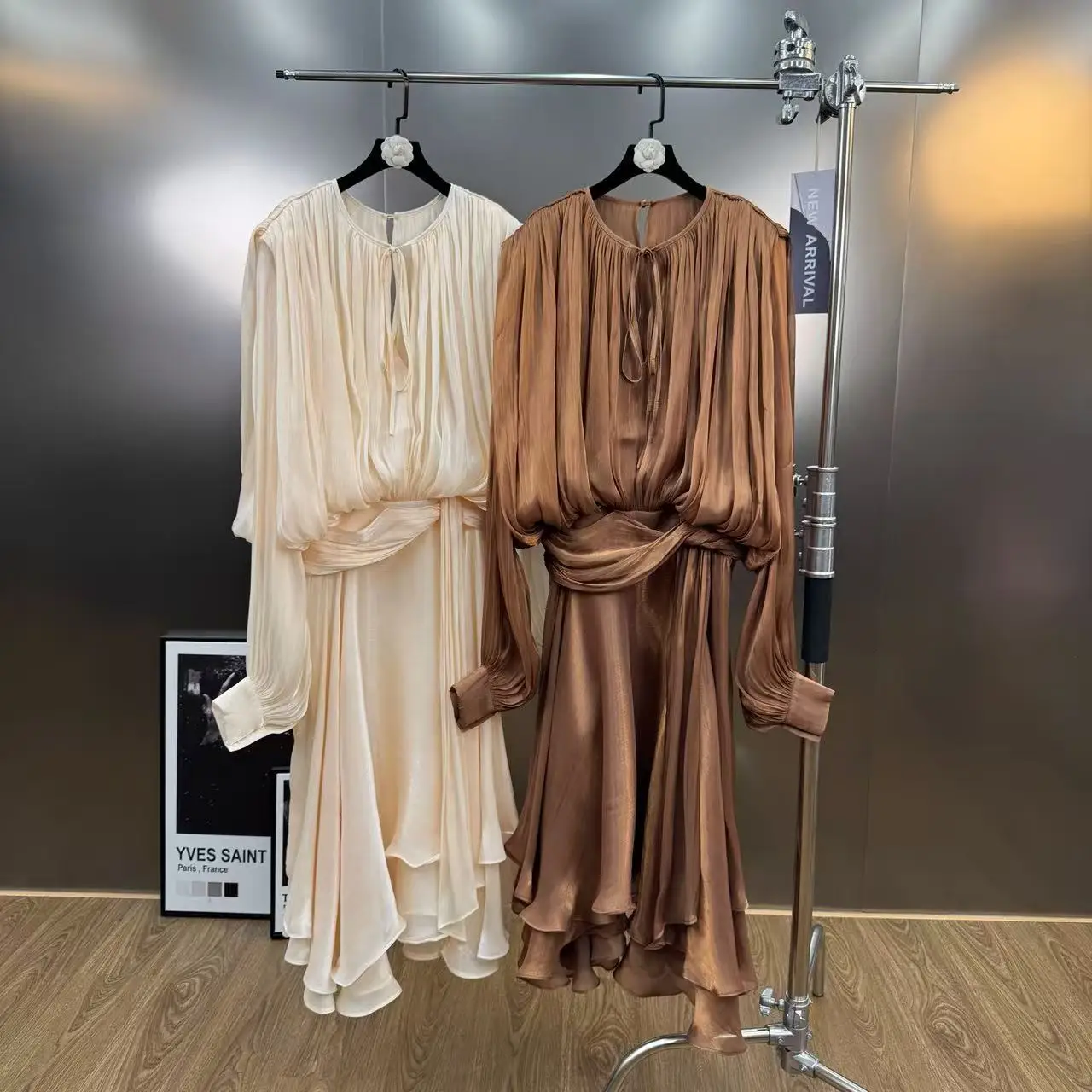 Wholesale Autumn 2026 New Fashion Elegance Temperament Crew Neck Bubble Sleeve Pinch Pleated Waist French Women's Dress