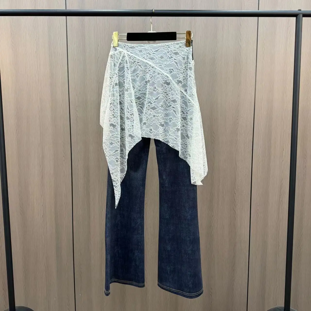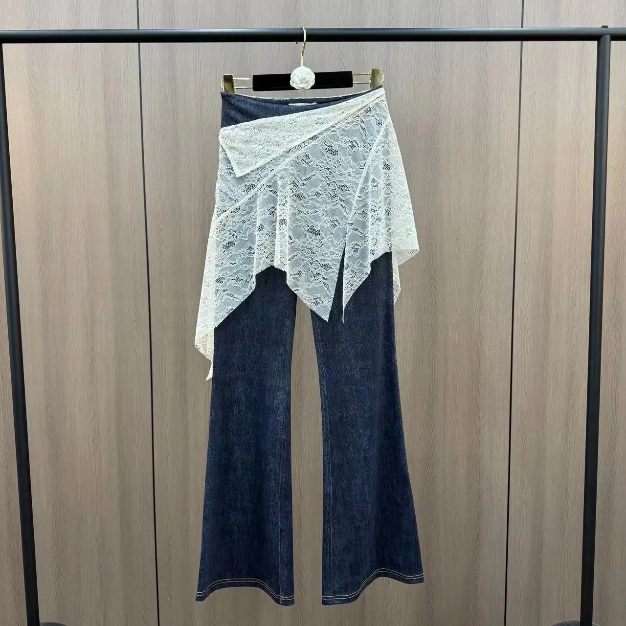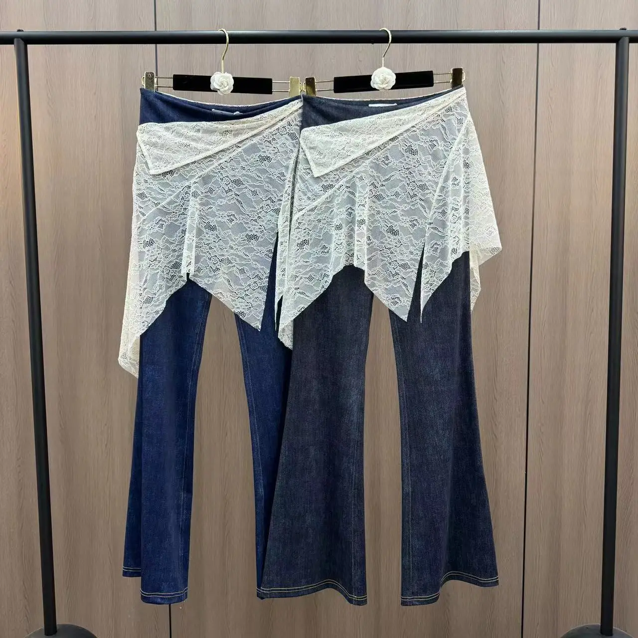 Wholesale Spring 2026 New Fashion Elegant Lace Splicing Fake Two-piece Solid Color Skinny Women's Jeans