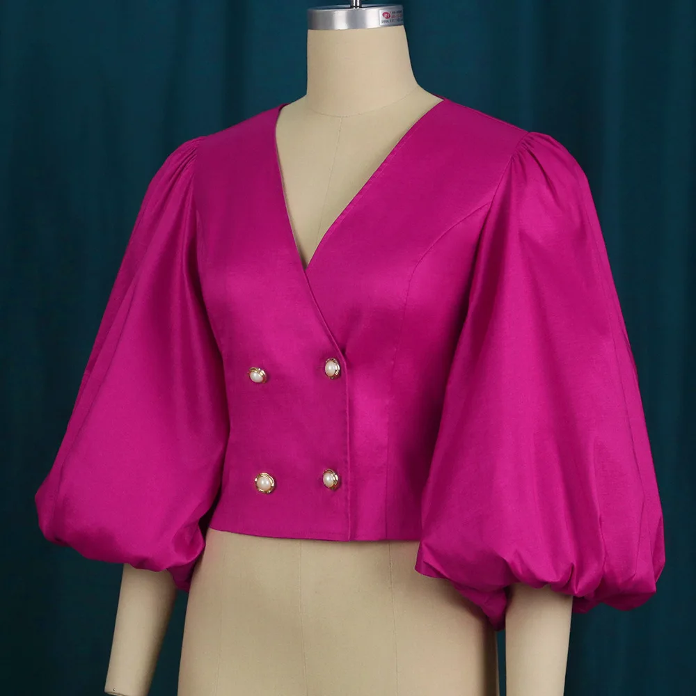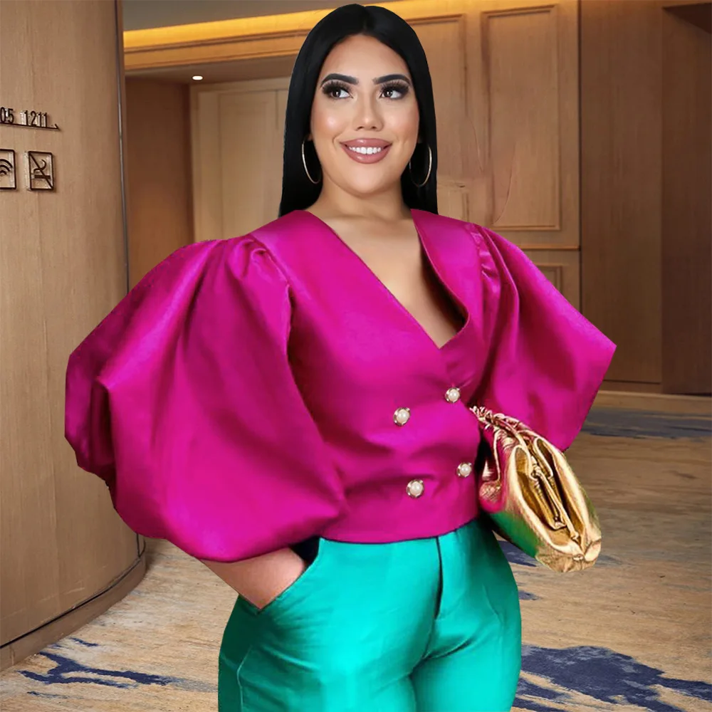 Wholesale V-Neck Puff Sleeve Button Cardigan Slim High Waist Tops Spring and Summer New 2026 Party Plus Size Women's Blouses