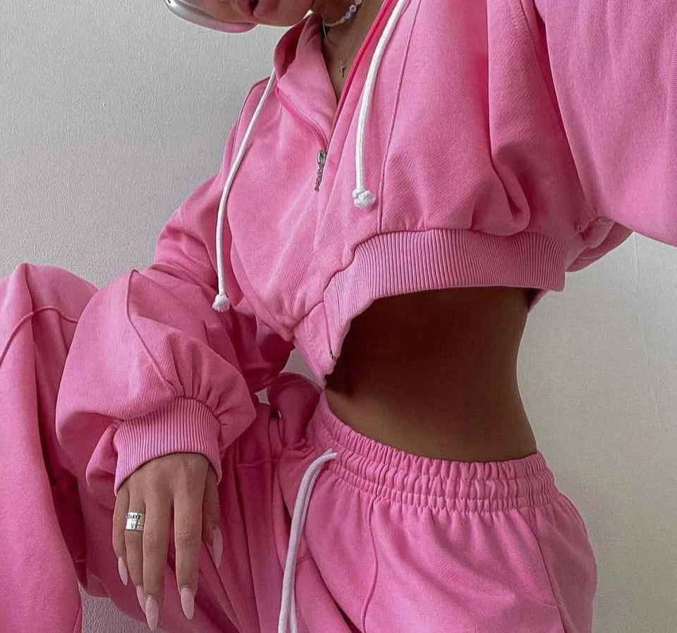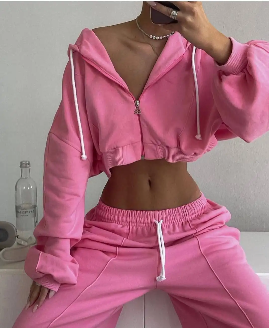 Women's Cropped Knitted Embroidered Drawstring Hoodie Sweatpants Set Ribbed Cuffs Hemline Custom Logo Washed Pullover Solid