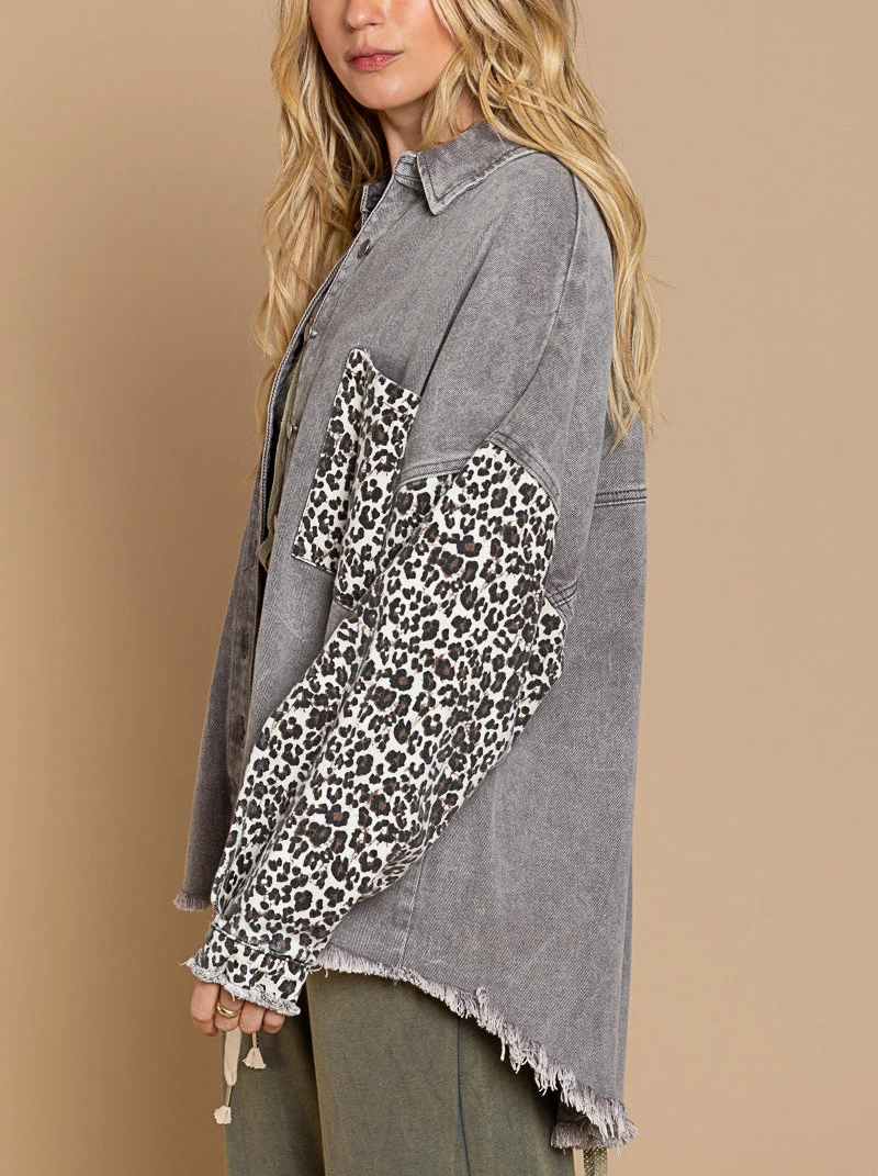 Custom Logo Leopard Patchwork Denim Shirt Jacket Oversized Button Down Distressed Hem Casual Vintage Washed Outerwear Women