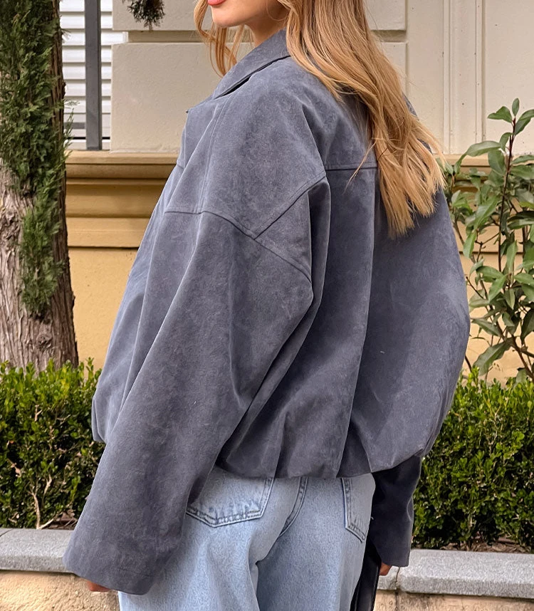 Custom Front Grey Faux Suede Zip Jacket Oversized Drop Shoulder Soft Suede Look Casual Outerwear Autumn/Winter Waterproof