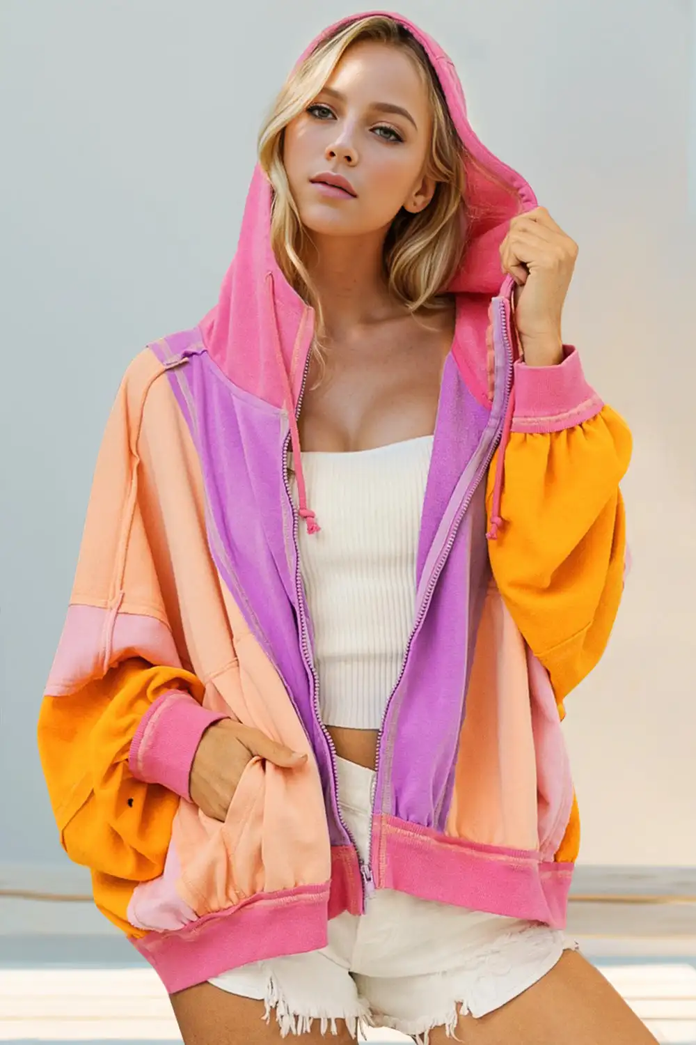 Autumn Trendy Casual Breathable Women's Hoodie with Drawstring Baggy Color Block Knitted Front Logo Zip-up for Winter Summer