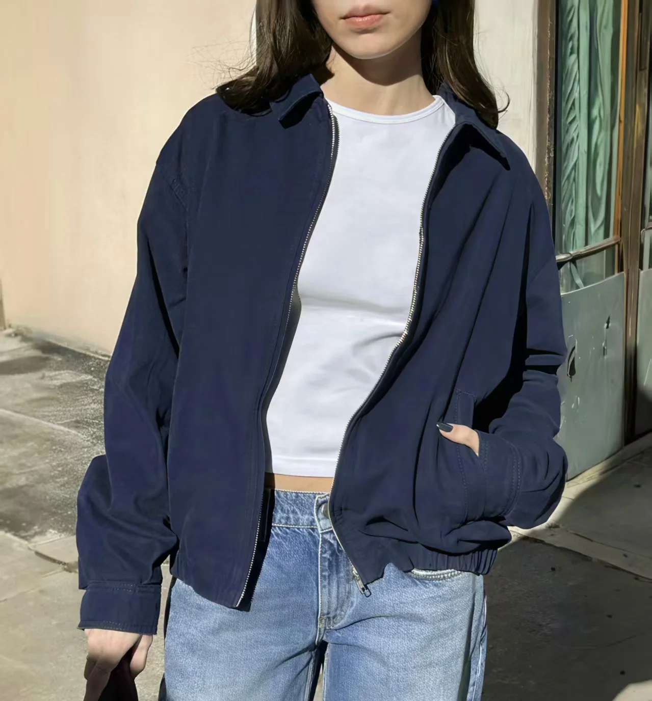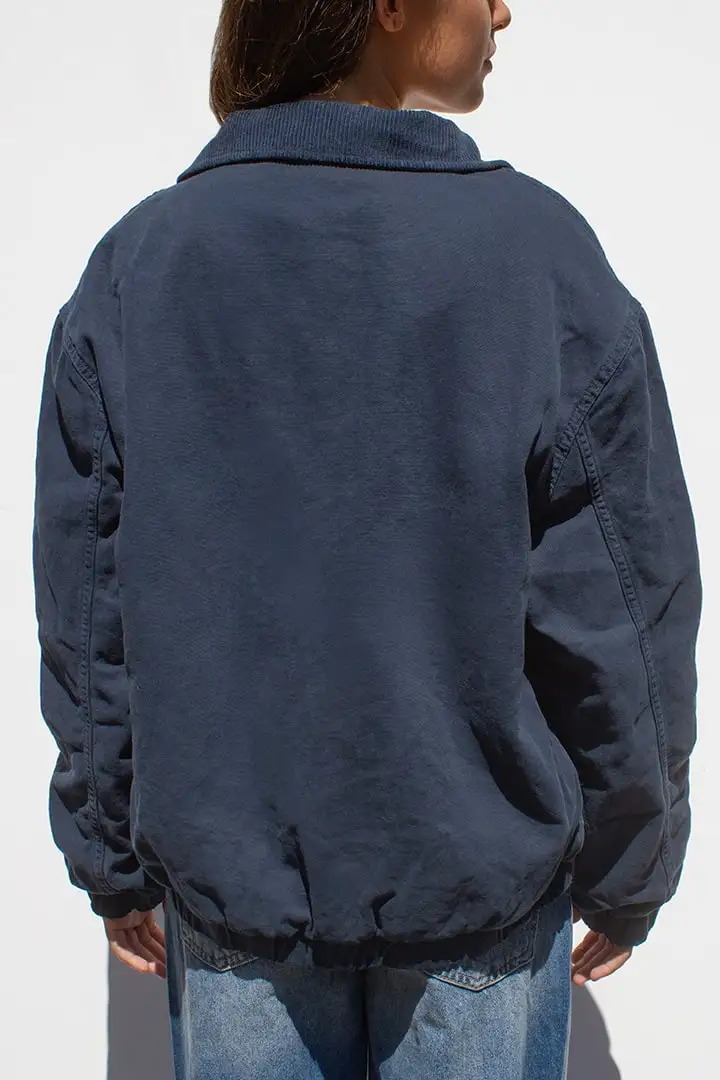 Custom Logo Navy Zip-Up Vintage Washed Autumn Winter Breathable Women's Turn-Down Collar Oversized Casual Outerwear Long Sleeve
