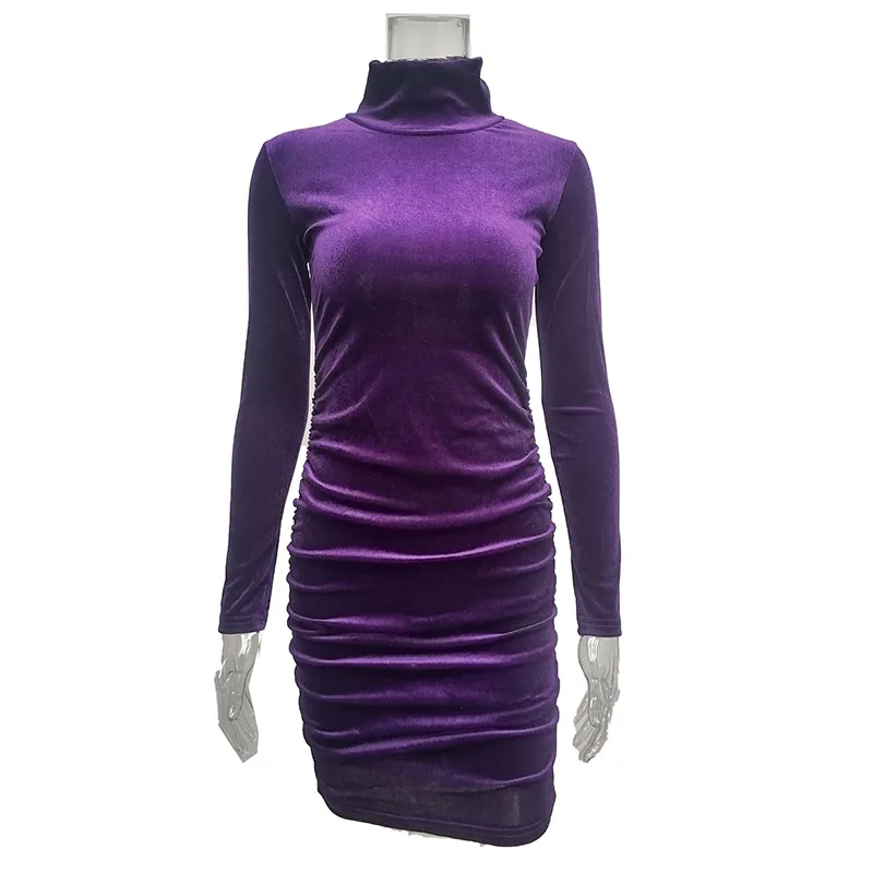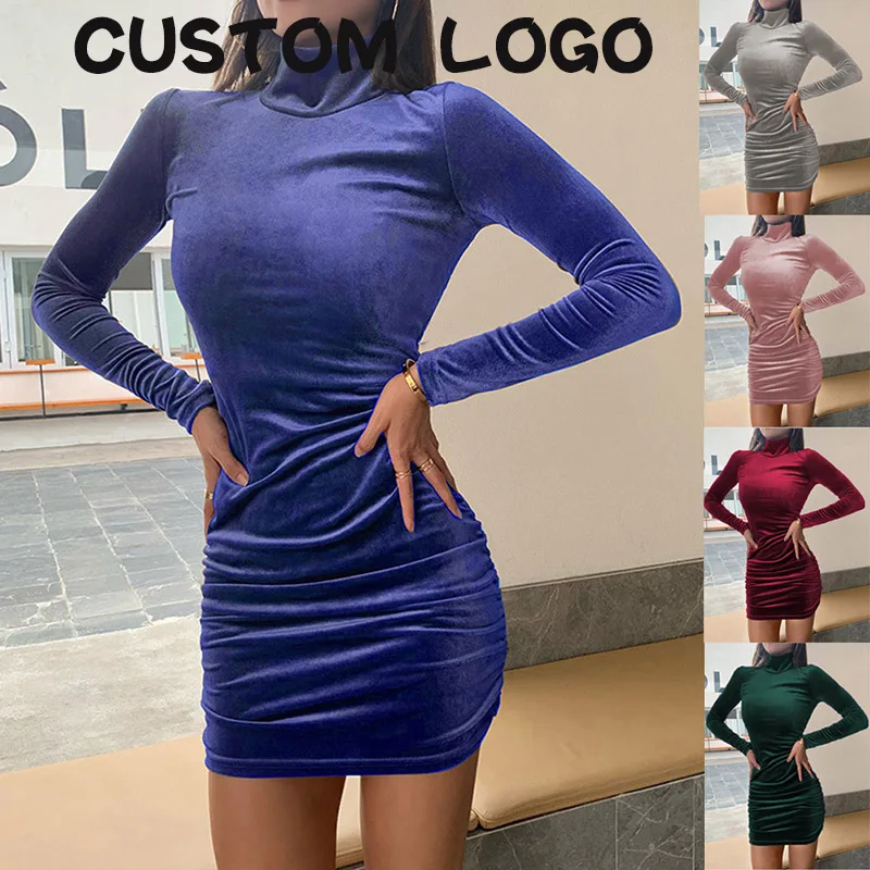 Custom High Quality Long Sleeve Slim Bodycon Velvet Mini Dress Women High-neck Sexy Skirt Suede Dresses