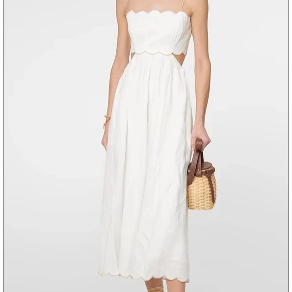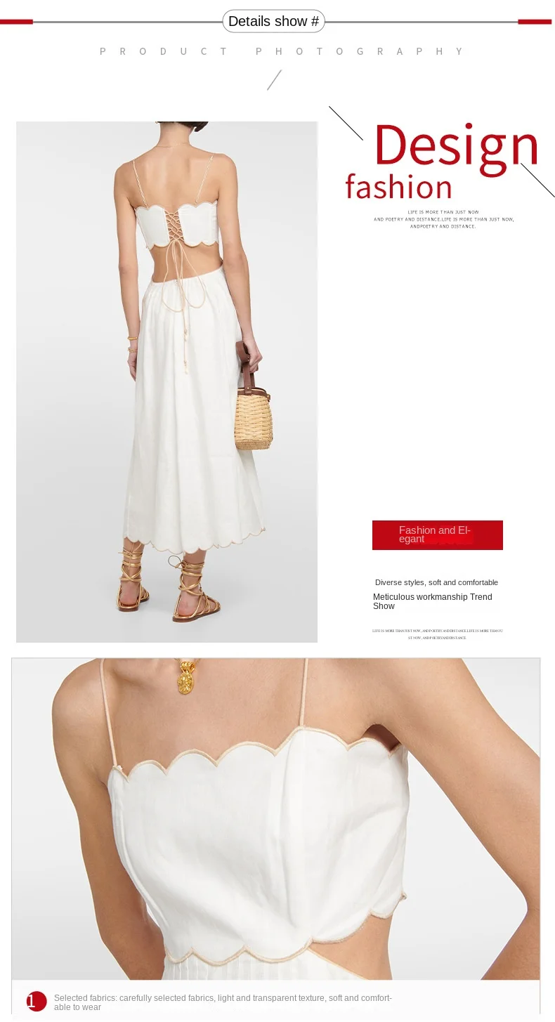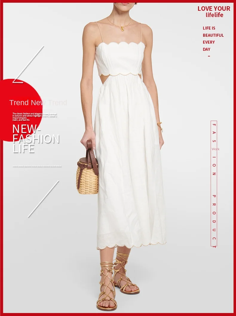 European American Casual Sweet Collarless Woven Linen Jacquard Translucent Sexy High Waist Skinny Fit Midi Skirt Dress Fashion