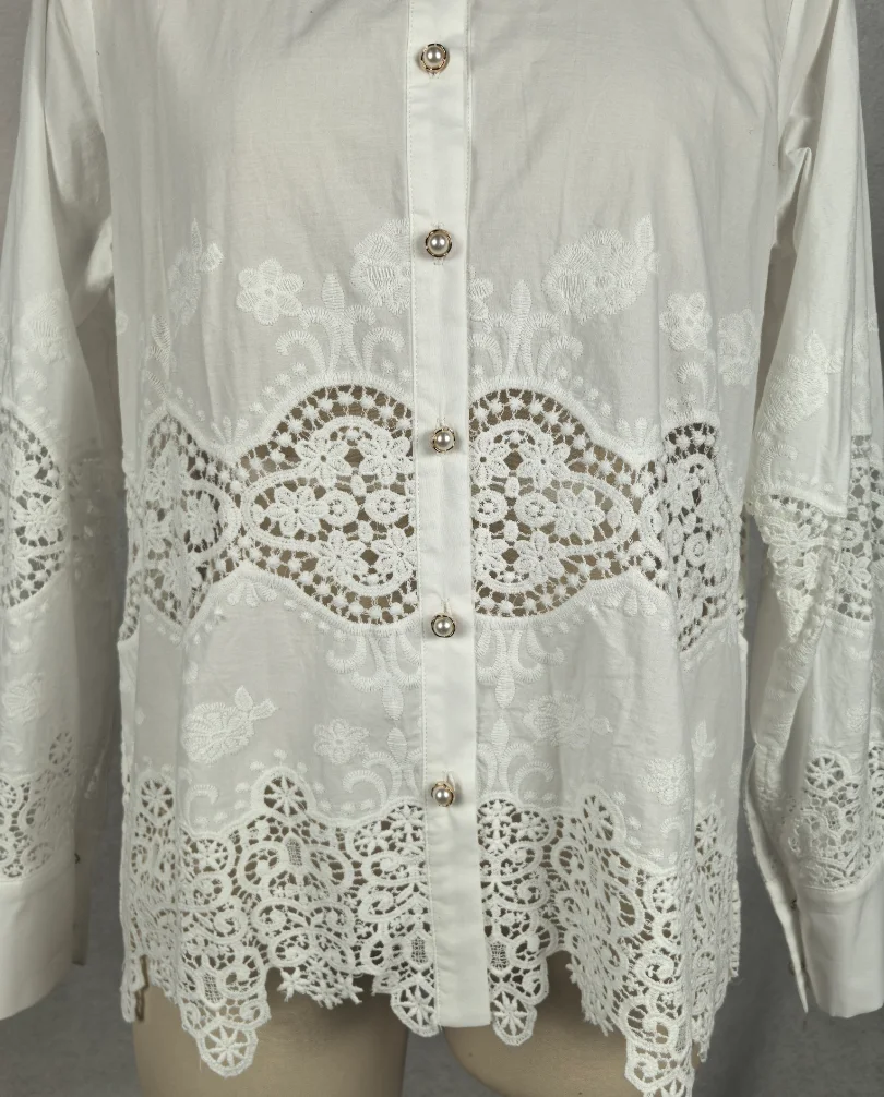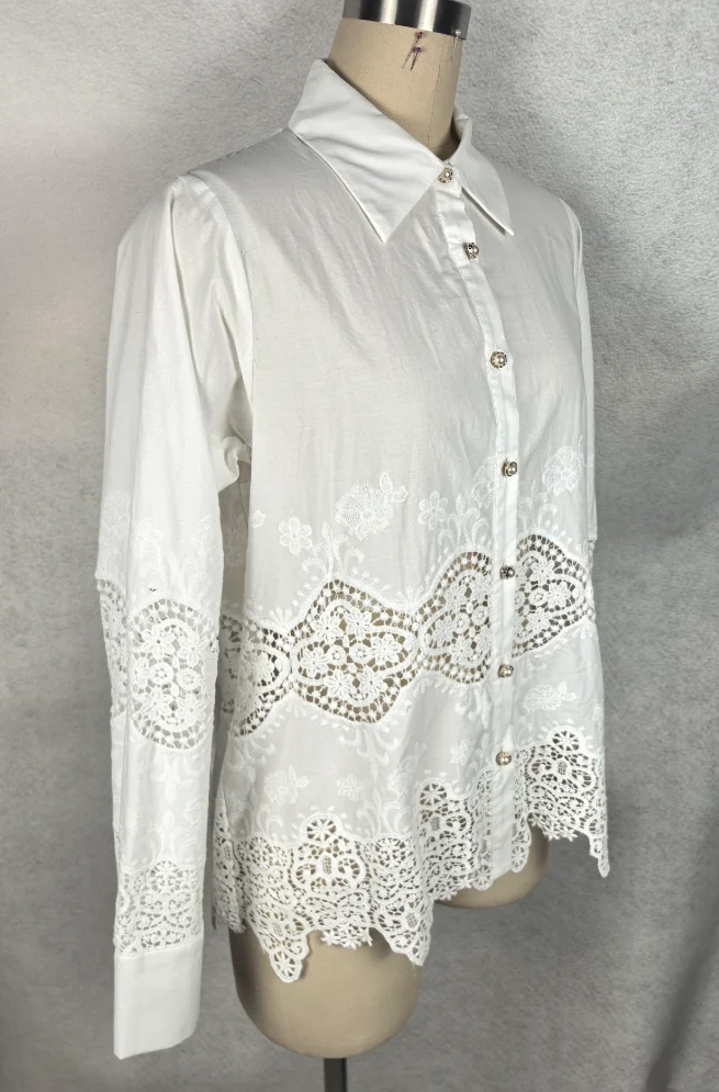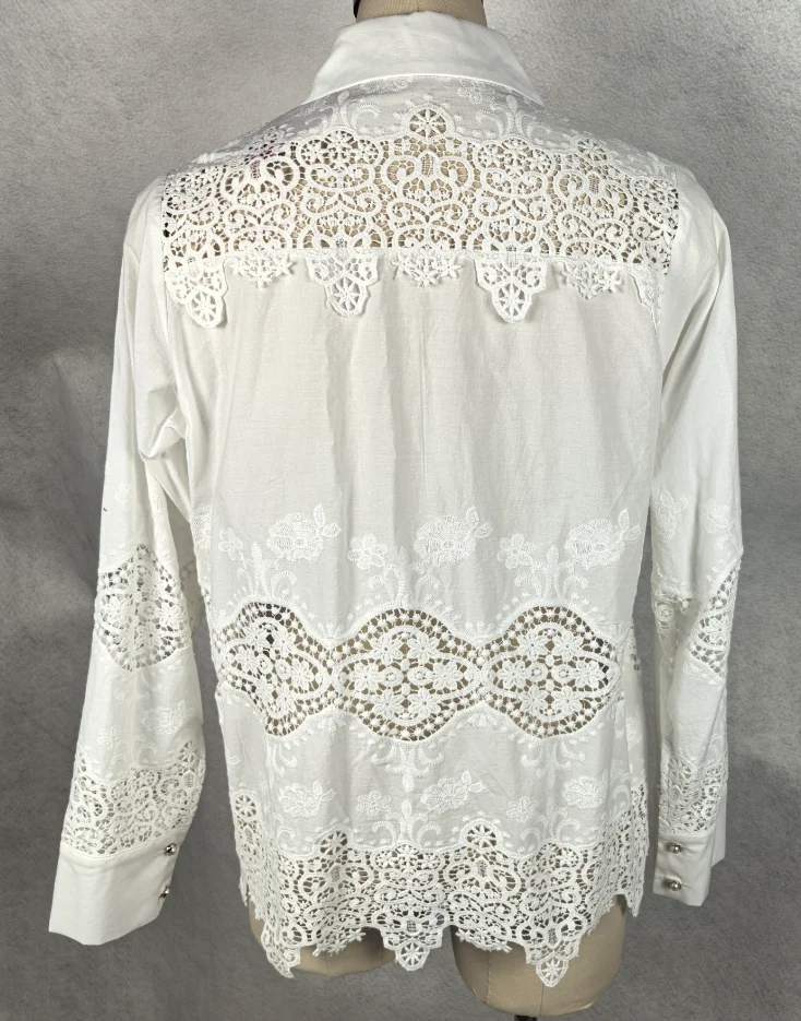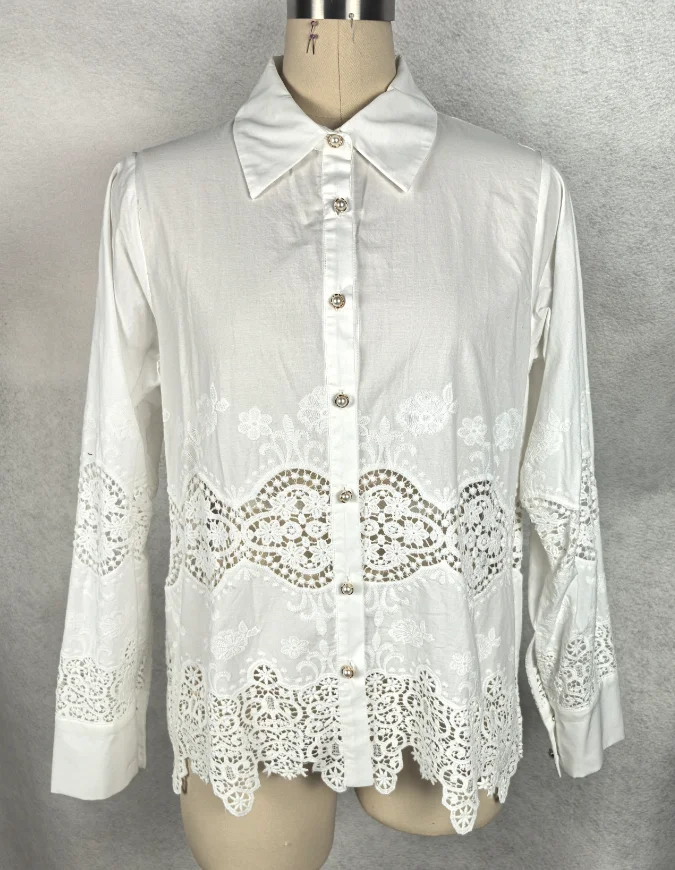 Women's White Vintage Casual Summer Breathable Lace Spliced Hollow Blouse Button Lapel Design French Afternoon Tea Party Light