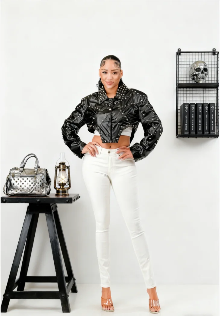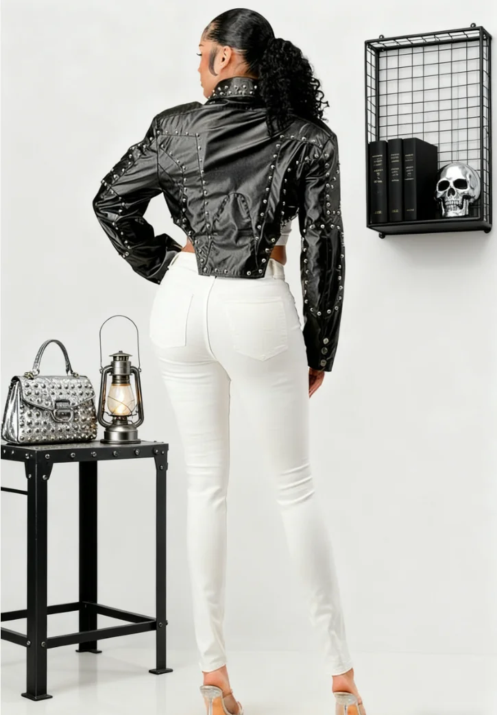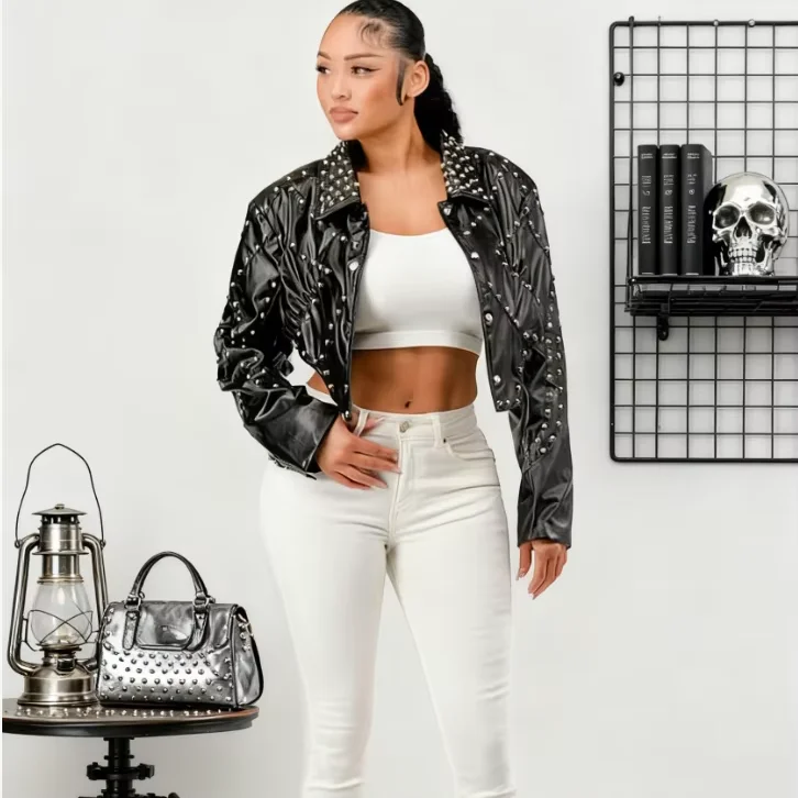 Women's Solid Short PU Leather Woven Jacket Rivet Design Button Decorations Y2K Style Autumn/Winter Fashion Spice Girls Inspired
