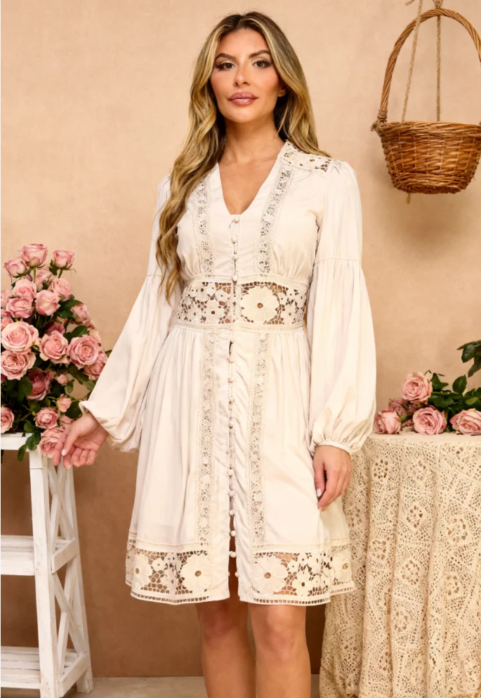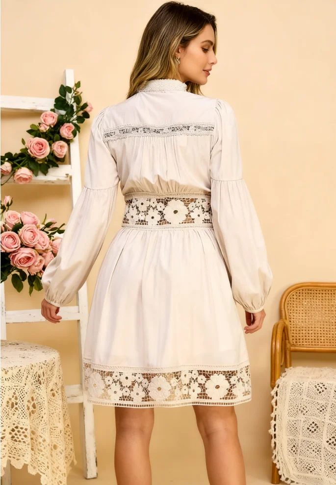 Women's Popular Sweet Bohemian Solid Casual Knee-Length Lantern Sleeve V-neck Lace Hollow Stitching Button High Waist A-Line