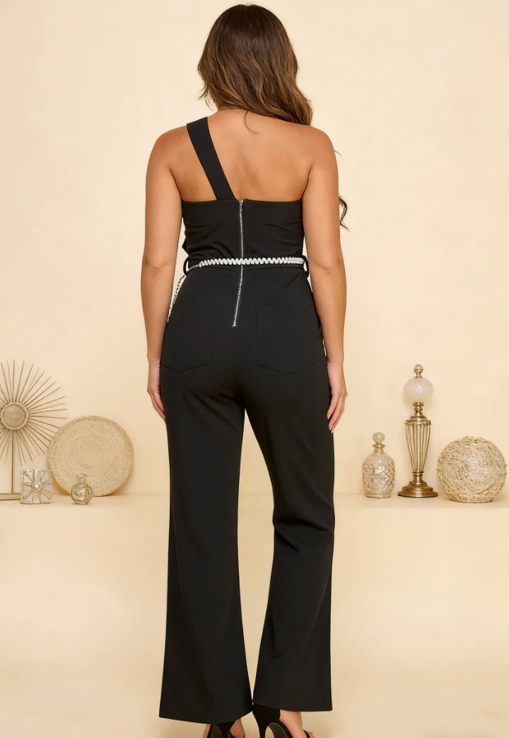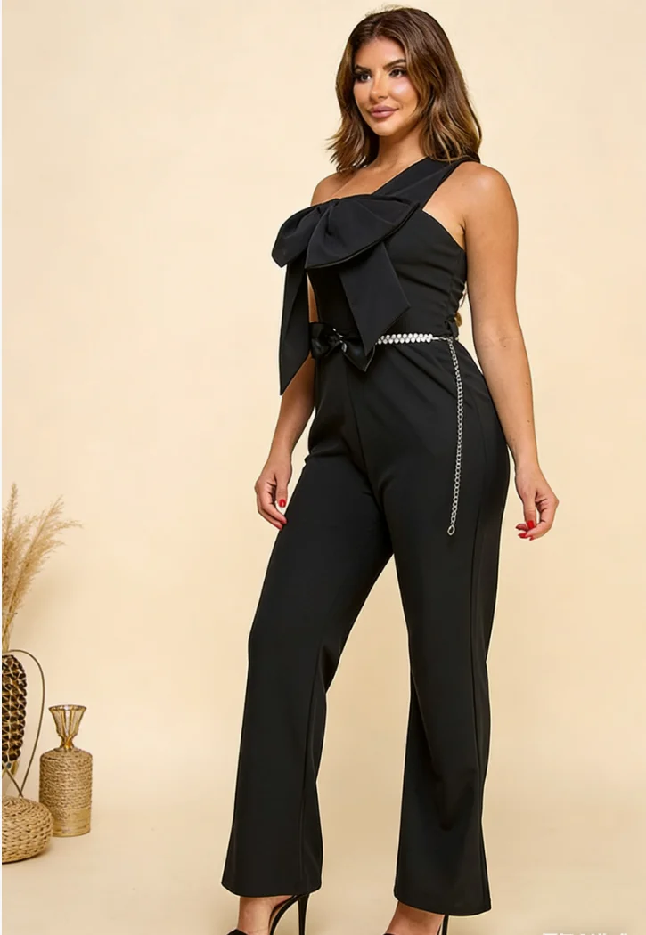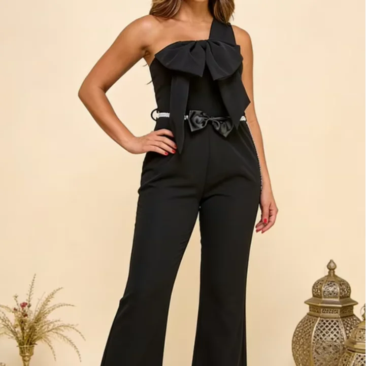 Elegant Women's Black Holiday Office Jumpsuit Asymmetrical Collar Belt Zipper Off-Shoulder Bow Embellishments Flared Legs High
