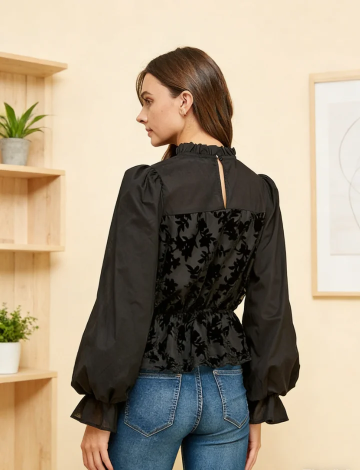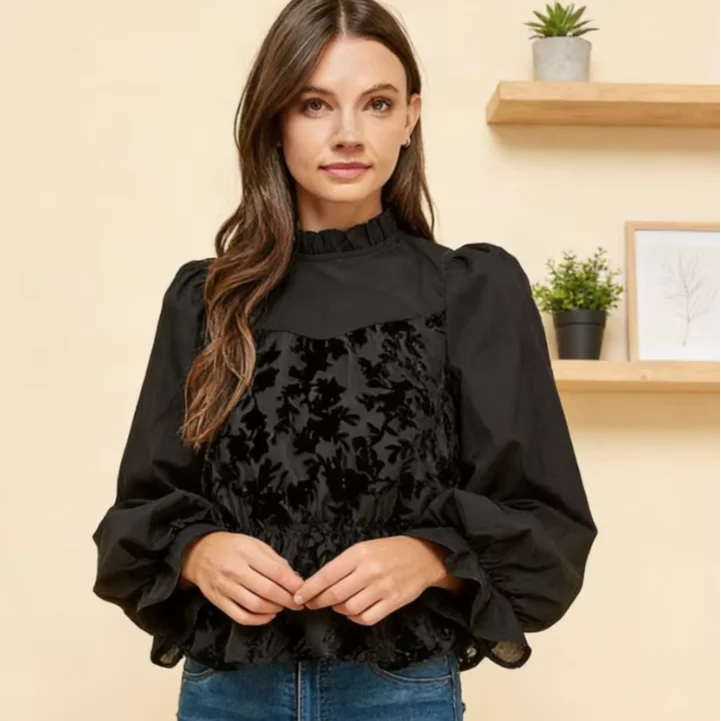 Women's Formal Black Floral Velvet Blouse-Loose Fit Woven Fabric Stand Collar Puff Sleeves Simple Design Spring/Winter/Autumn