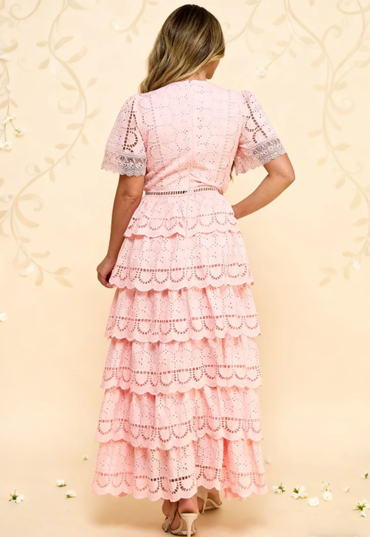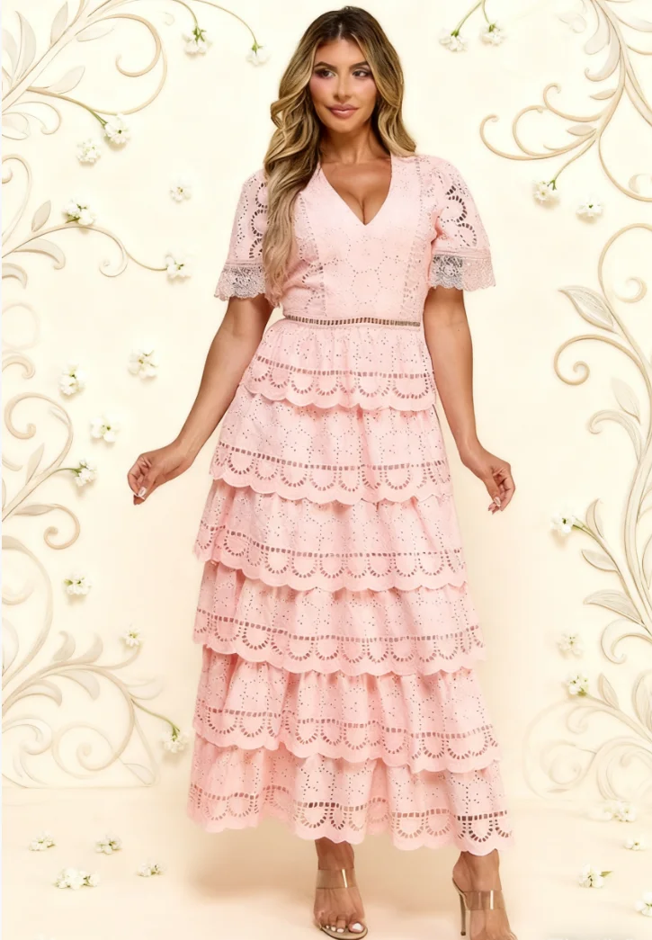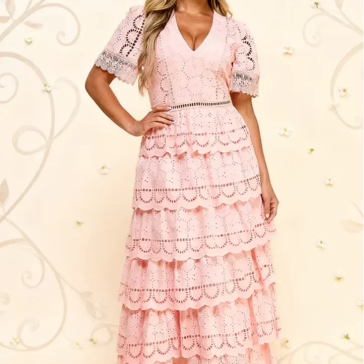 Women's Spring Autumn Cotton Maxi Dress Tiered V-Neck Short Sleeve Embroidered Crocheted Woven Lace High Waist Fitted Geometric