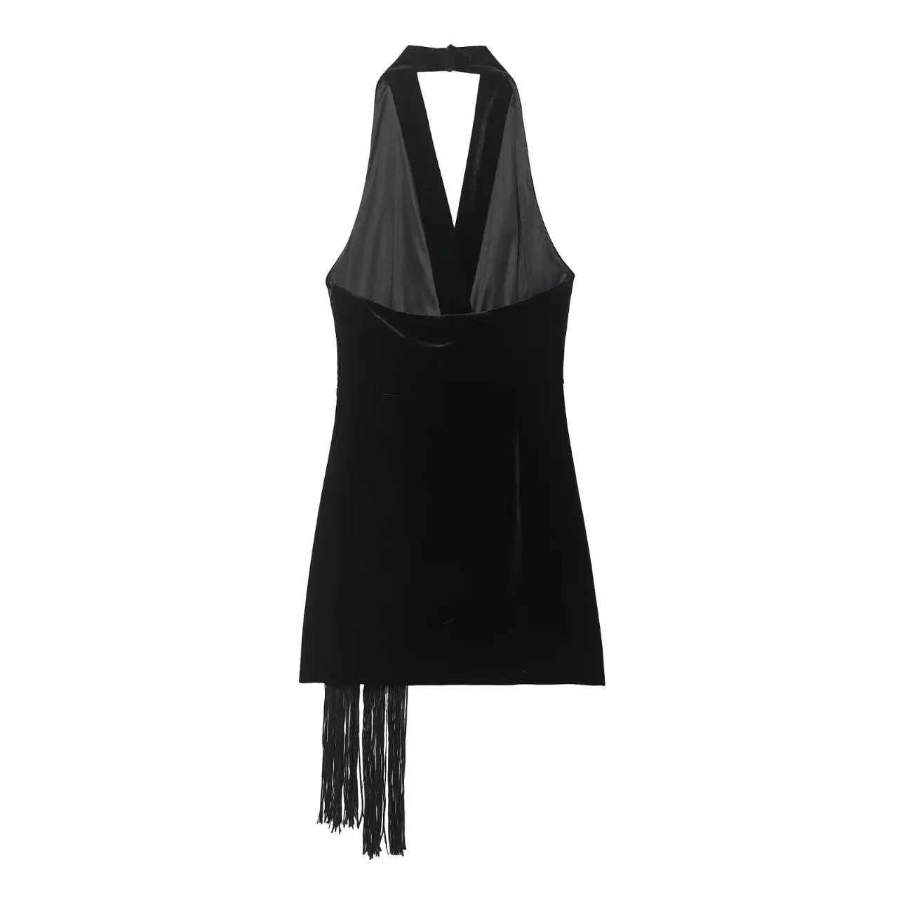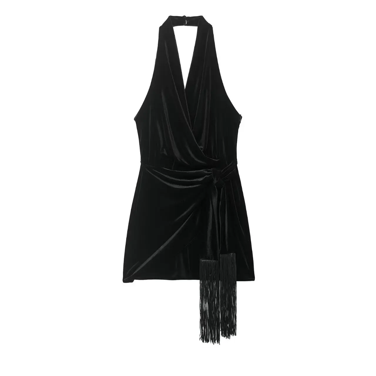 European American Cross-border Women's Vintage Velvet Halter Neck Tassel A-Line High Waist Sleeveless Summer Dress Belt Woven