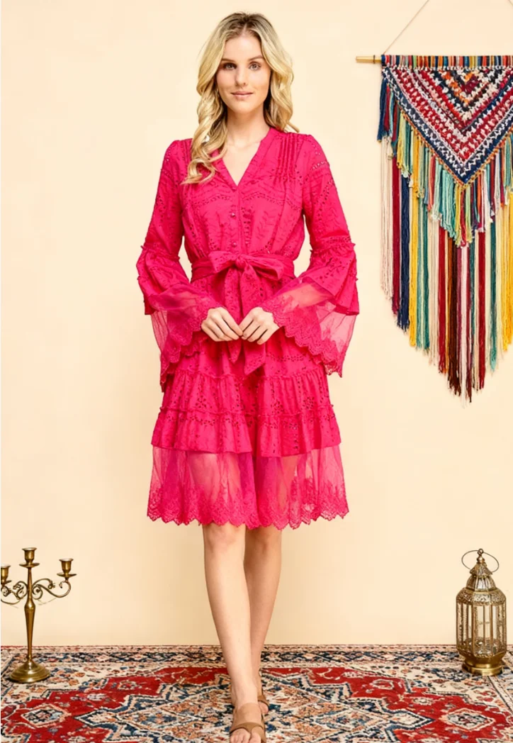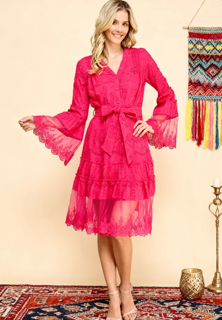 Women's 100% Cotton A-Line Knee-Length Gown Flare Sleeves High Waist Lace Belt Button Drawstring Sweet Style Spring Autumn