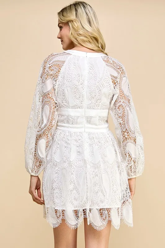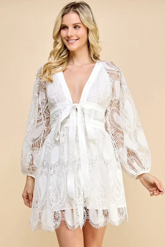Women's Retro Sweet Breathable Mini Dress Long Sleeve A-Line V-Neck Halter Lace-Up High-Waist Translucent White Summer