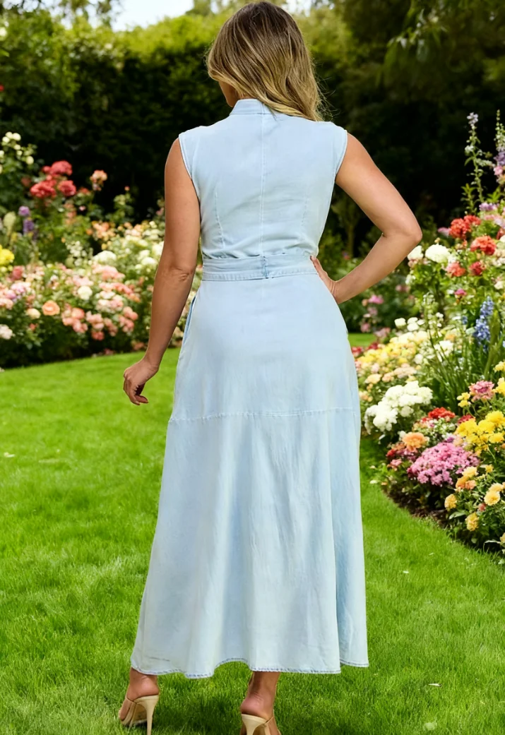 Women's Formal Casual Asymmetric Maxi Denim Dress Summer Sleeveless Belted Waist Light Technique 3D Flower Brunch Gatherings