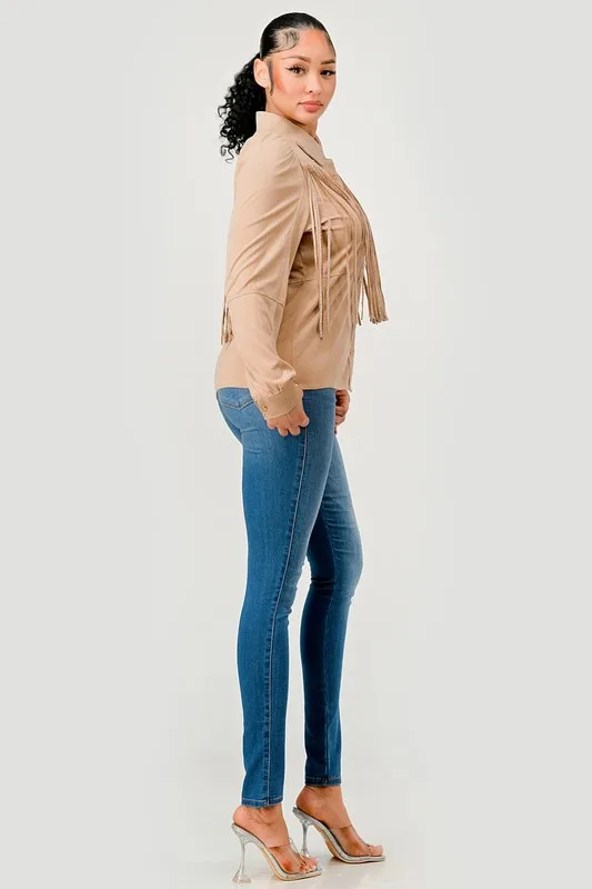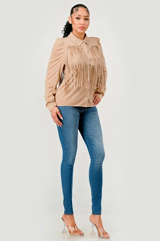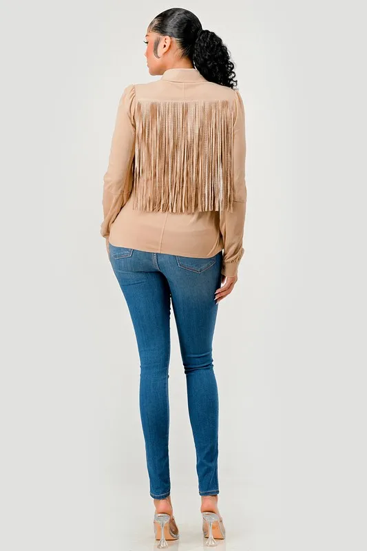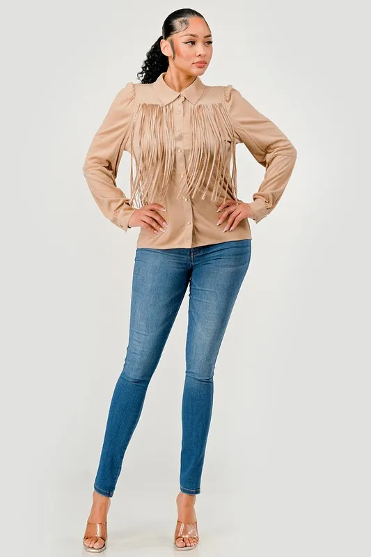 Women's Vintage Suede Beige Woven Shirt with Tassel and Button Decoration Long Sleeve Buckle for Winter/Spring Casual Wear