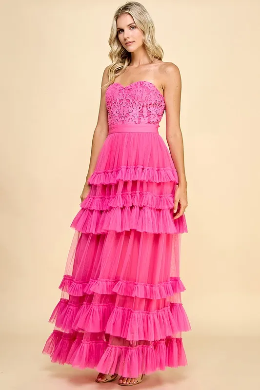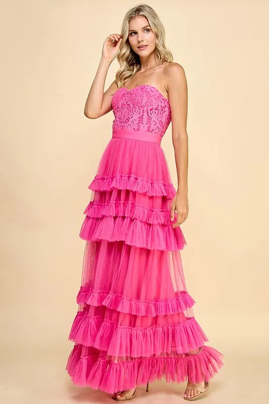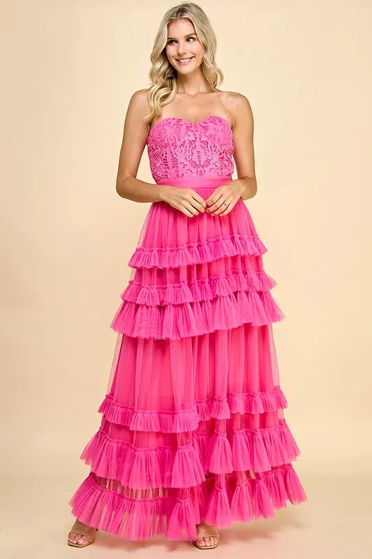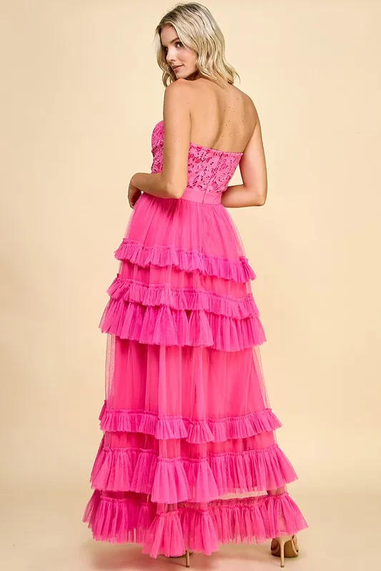 Women's Elegant Romantic Asymmetric Neck Maxi Dress Lace Bodice Tiered Ruffles Solid Summer Party Custom OEM/ODM Service Cute