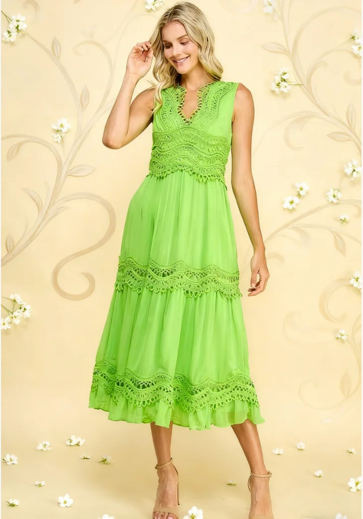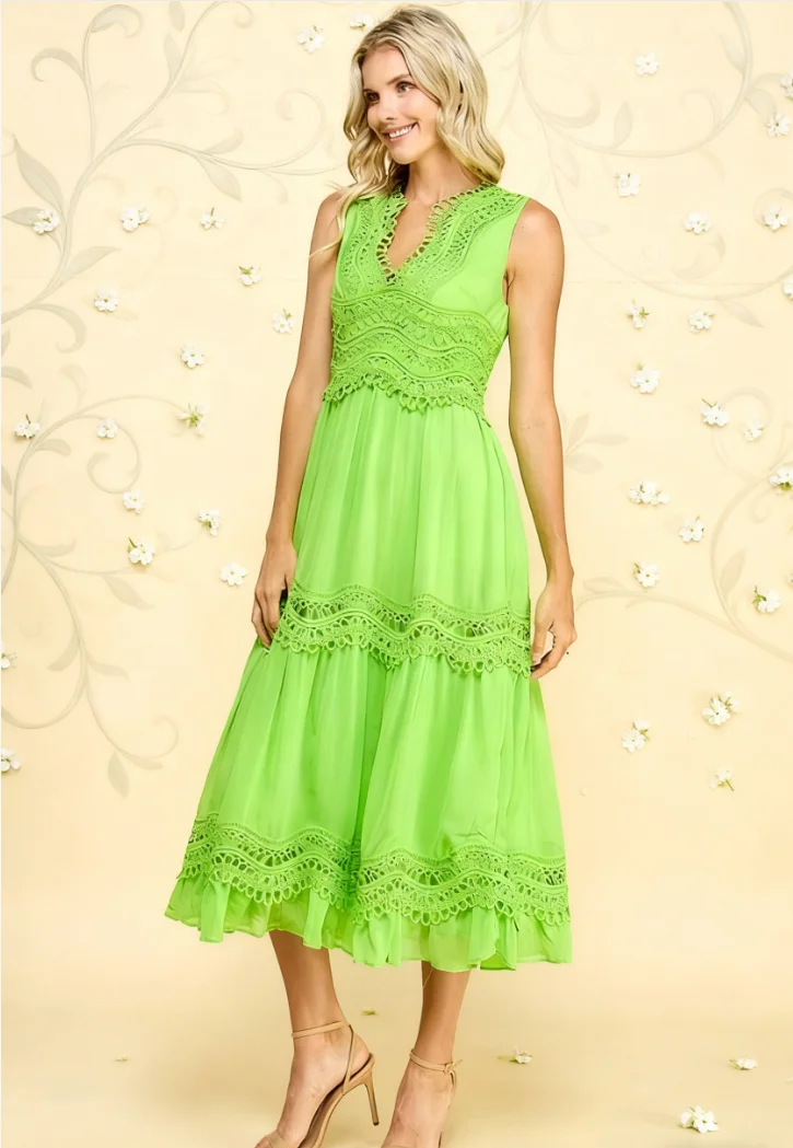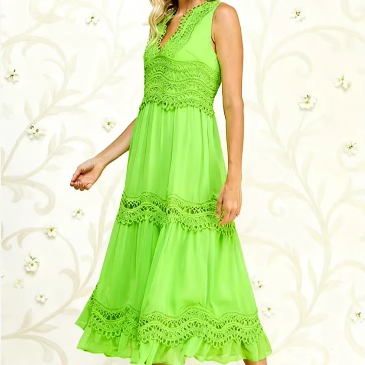 Women's Casual Sweet Boho Solid Woven Maxi Dress V-neck High Waist Sleeveless Lace Zippers Crochet Trim Fit Flare Tropical