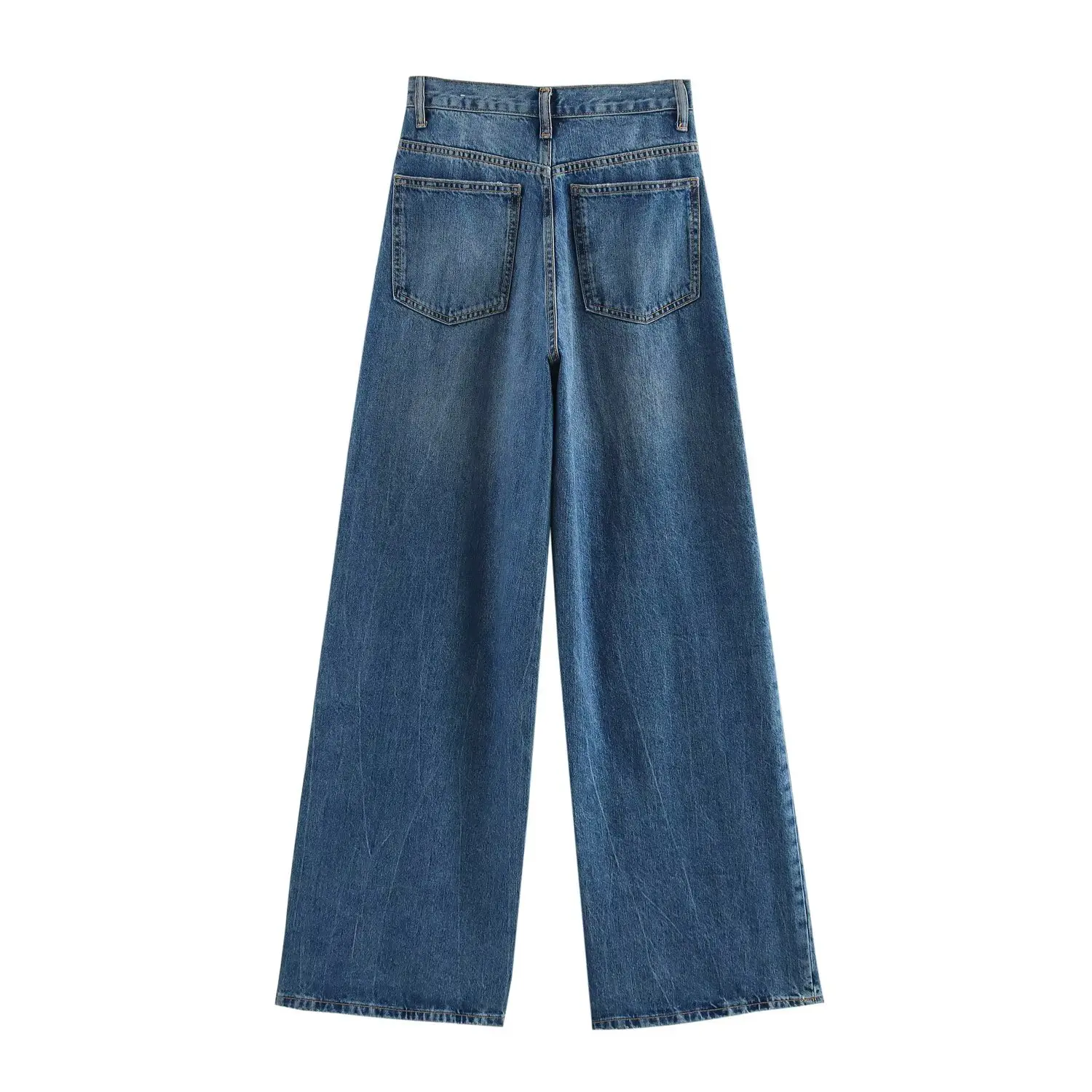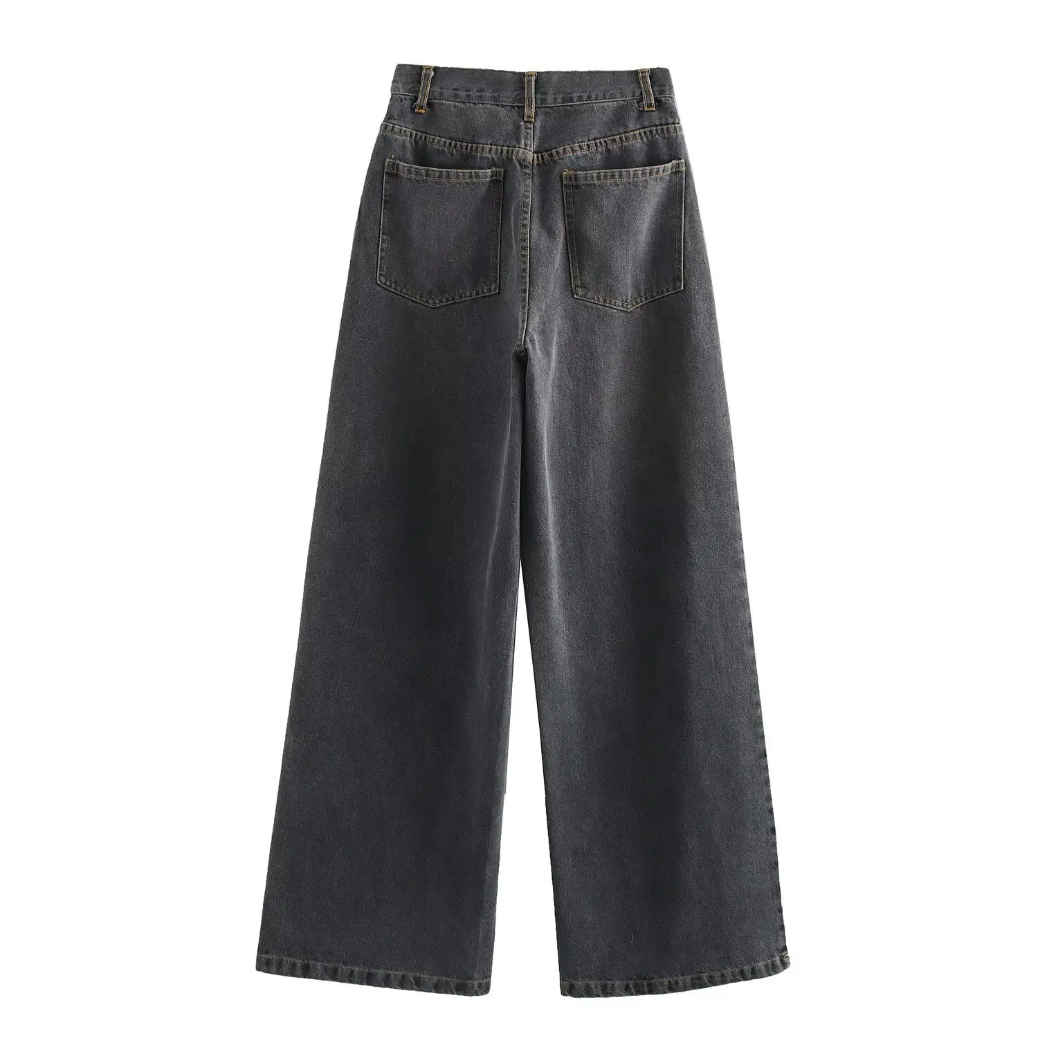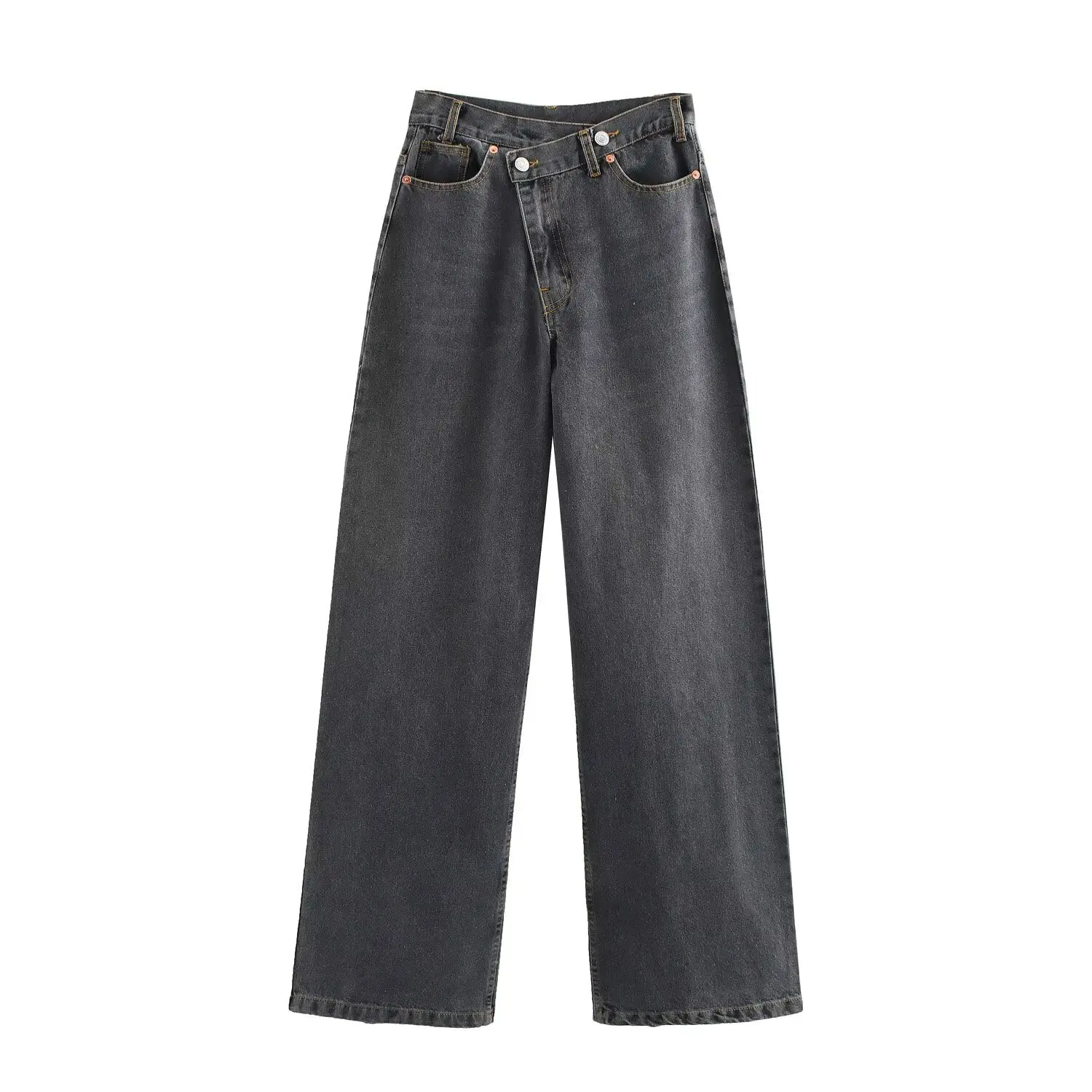 European and American Style New Women's Summer Dark Solid Button Basic All-match High Waist Wide Leg Washable Denim Pants