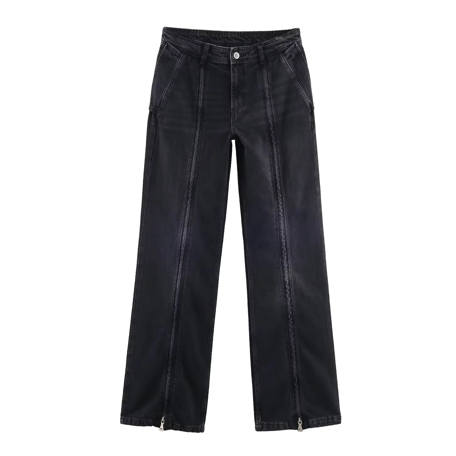 European and American Style New Women's Classic Loose Mid-Waist Dark Washed Denim Summer Wide Leg Zipper Jeans