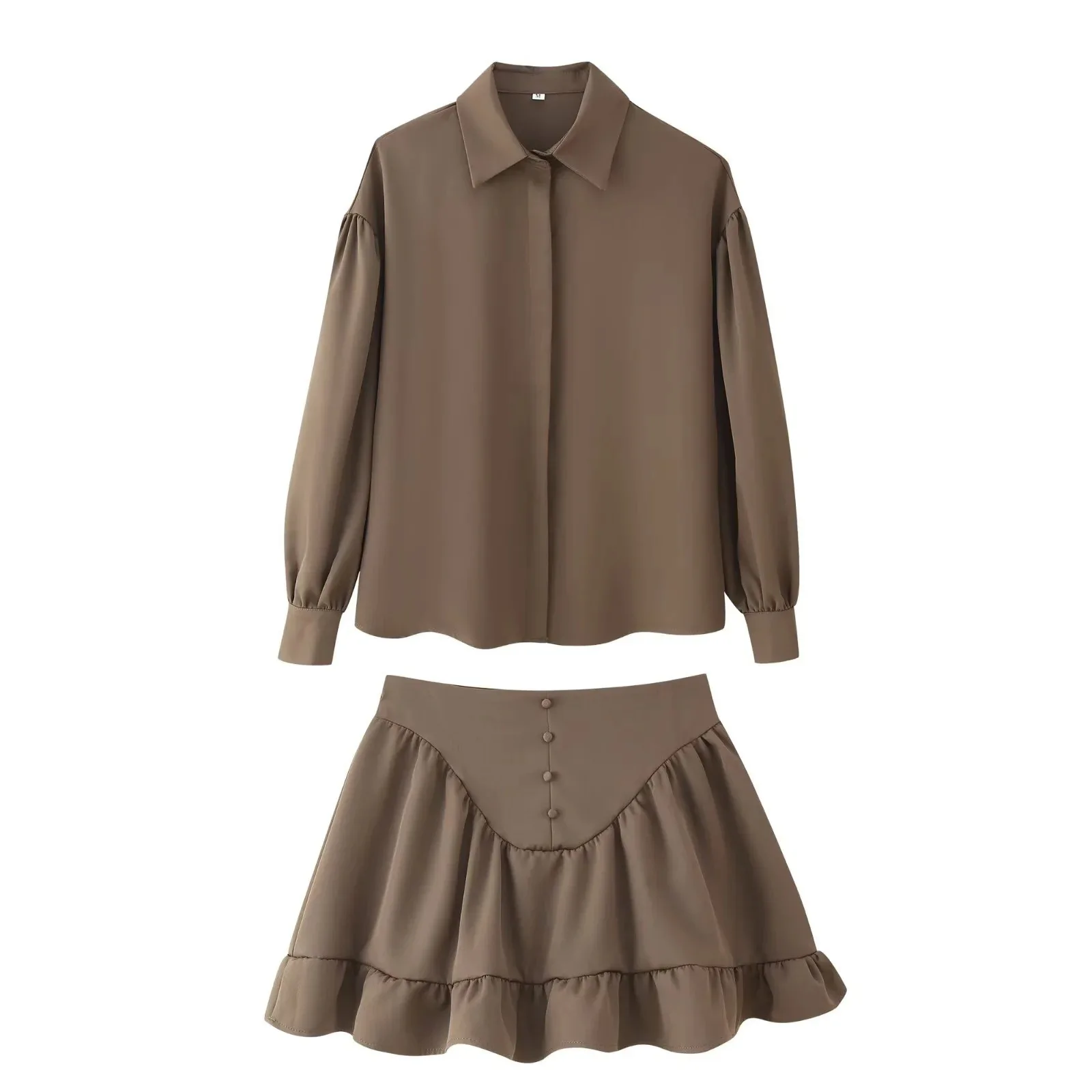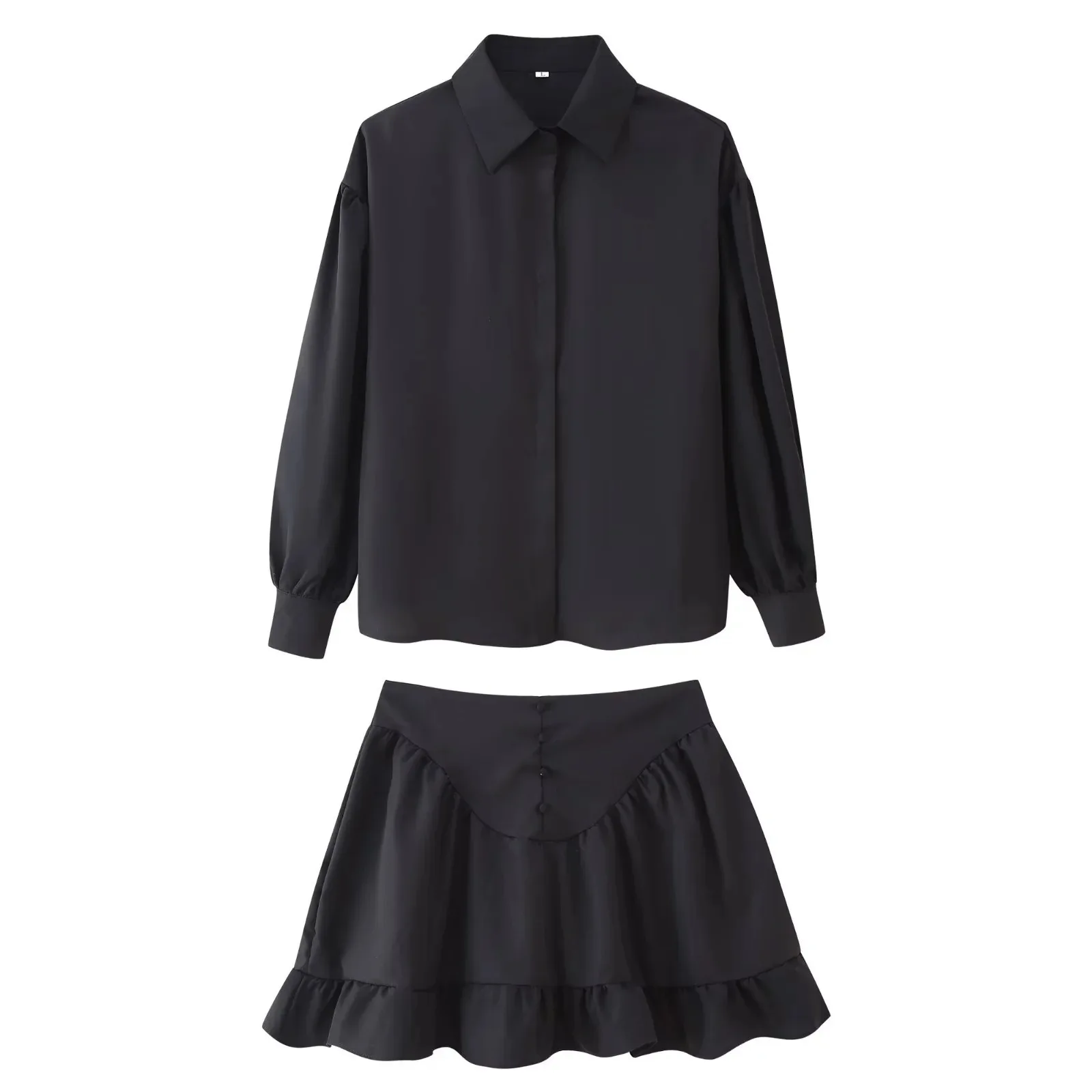 European American Women's Spring Daily Wear One Set Solid Woven Loose Fit Temperament Lapel-breasted Shirt Ruffled Skirt Buttons