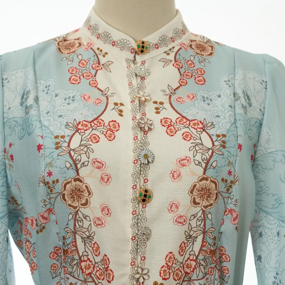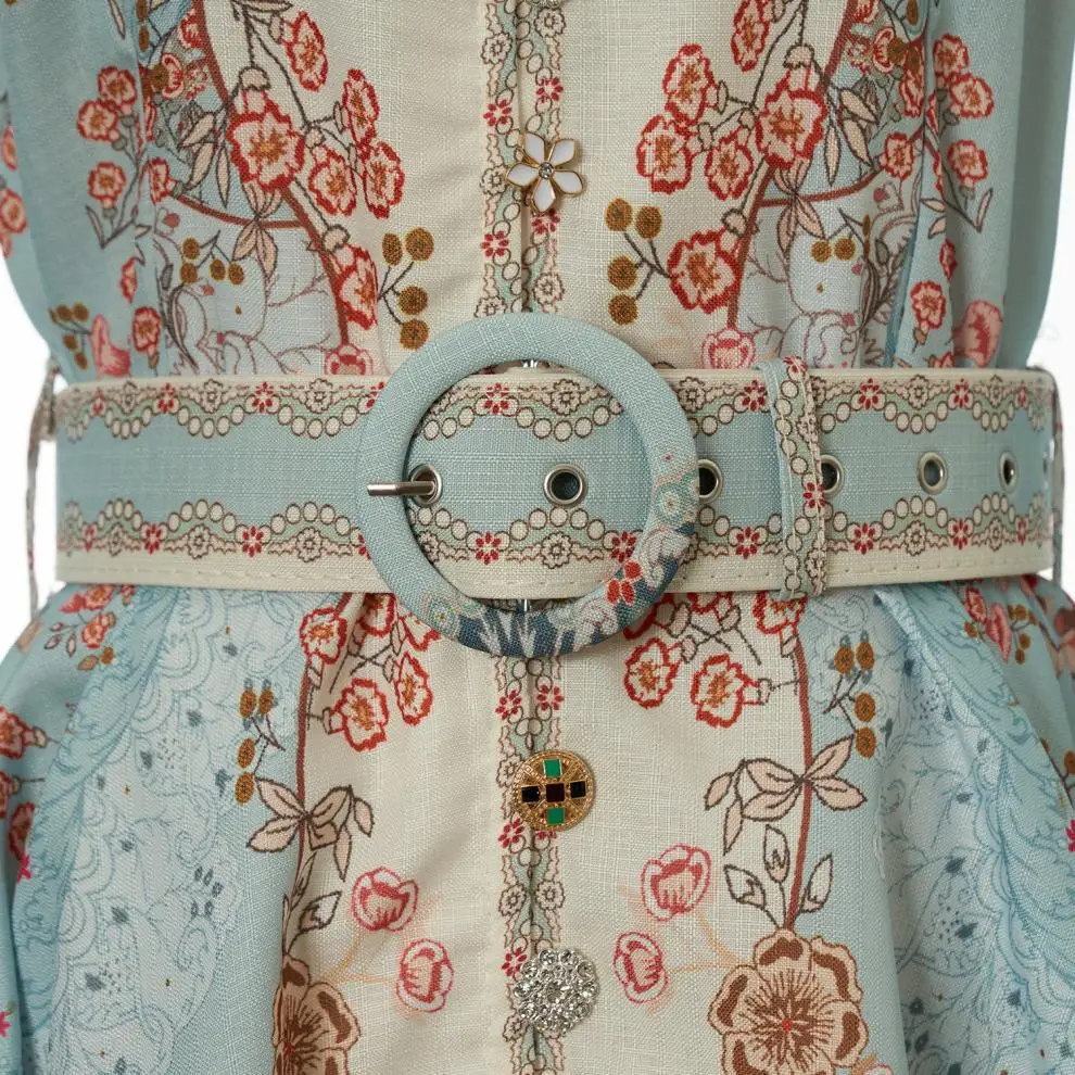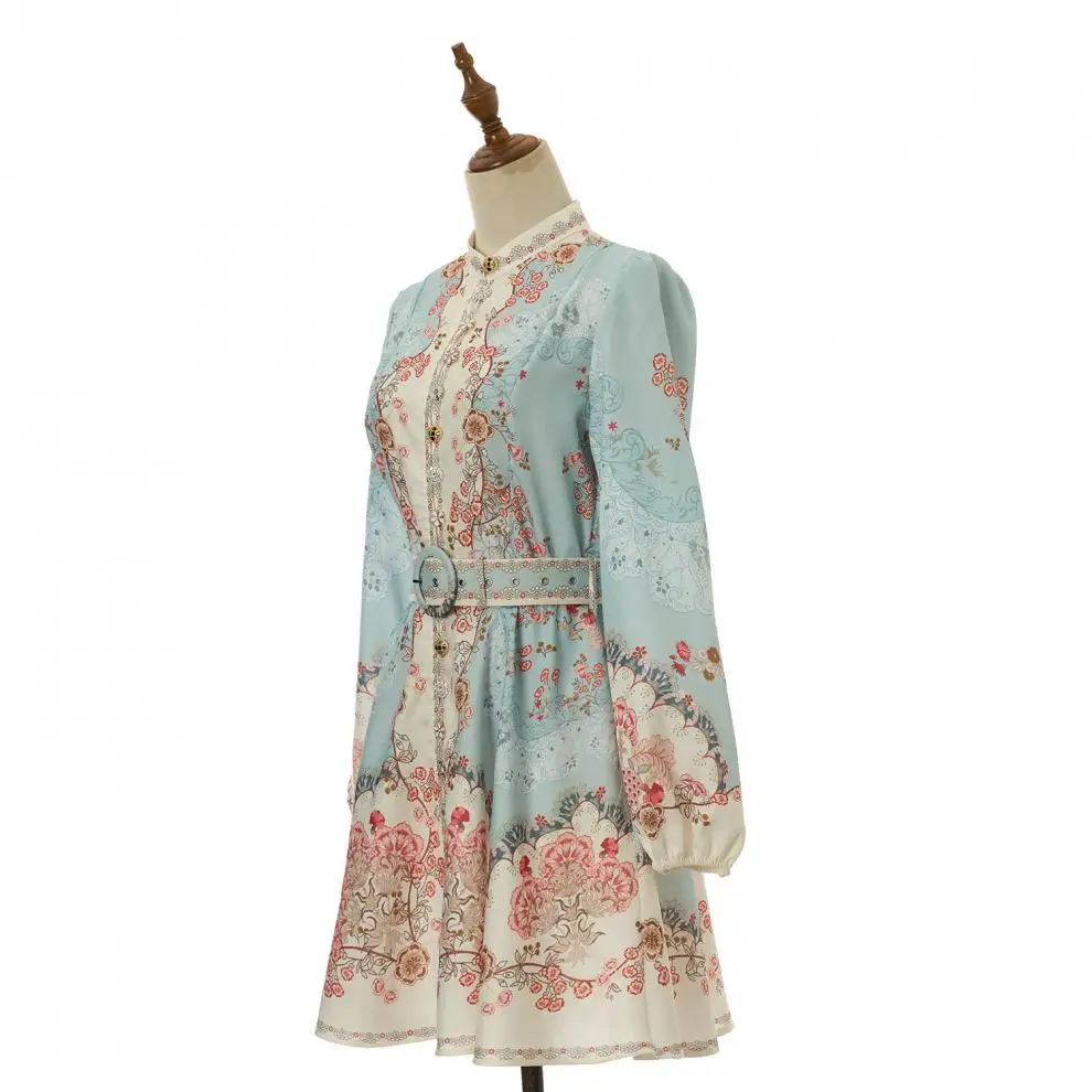 Cross-border New Design Sense High Version Single-breasted Stand Collar Lantern Sleeve Floral Knee-Length A-Line High Waist Belt