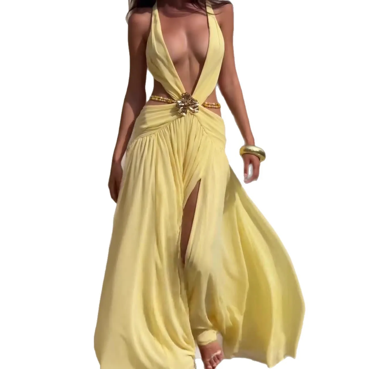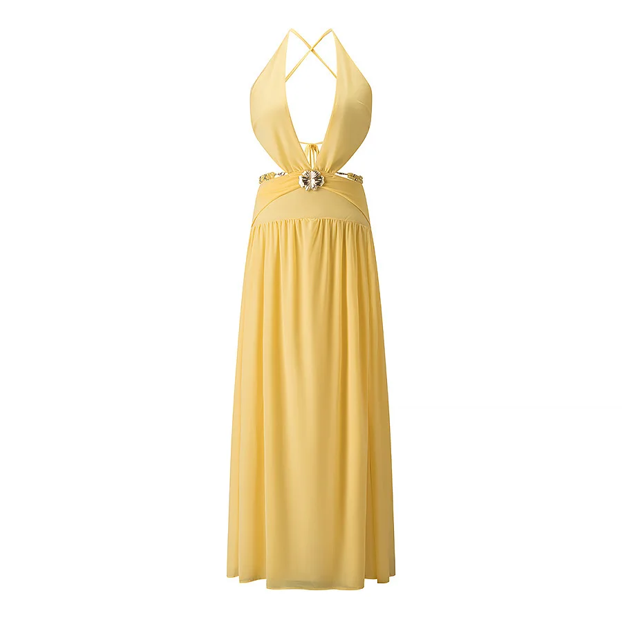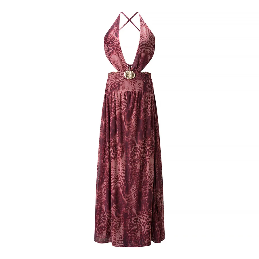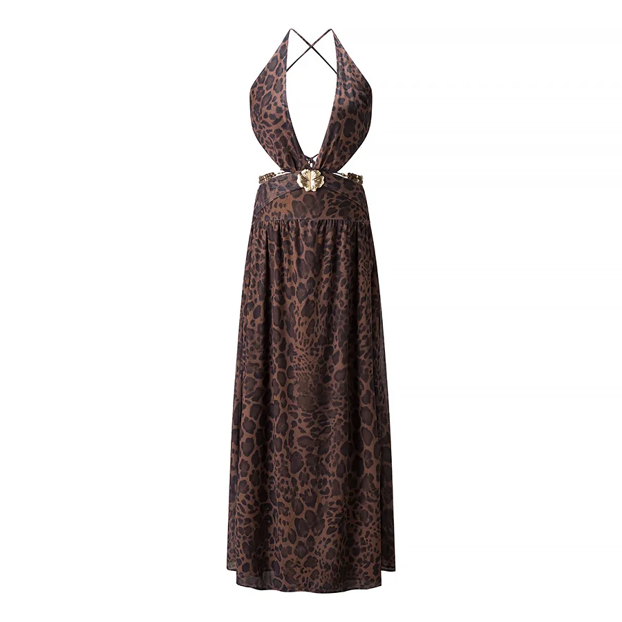 Summer New European American Women's Sexy Cross Neck Backless Empire Waist Leopard Digital Printed Woven Long Day Dress