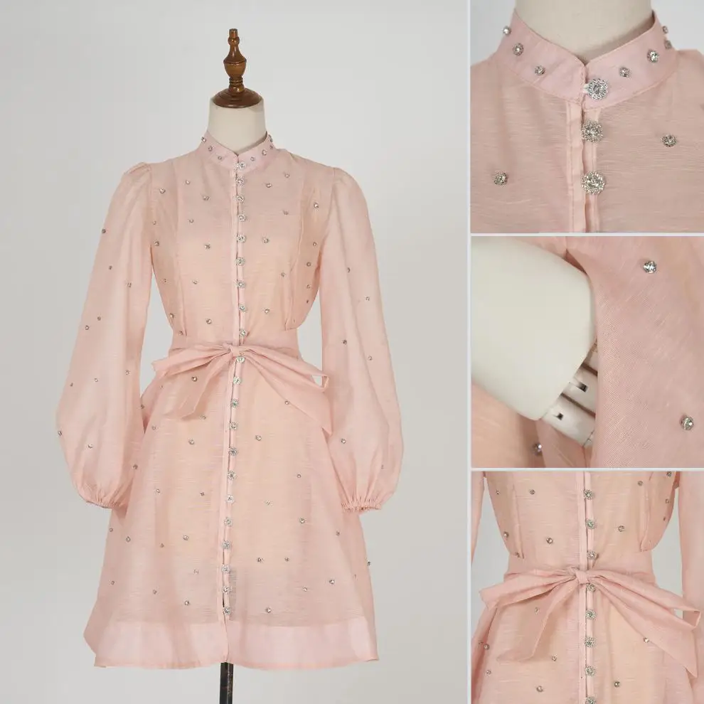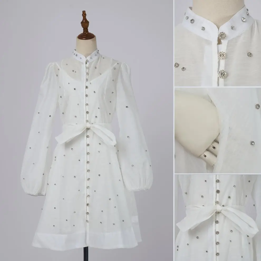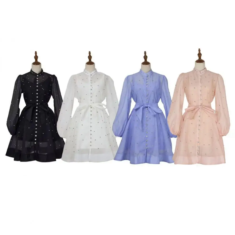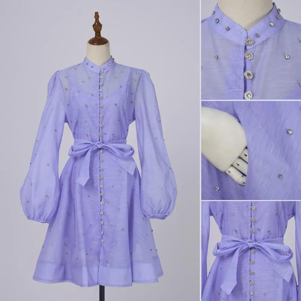 Bohemian Empire Waist Autumn Mock Neck Lantern Sleeve Solid Color Knee-Length Anti-Static Gastrodia for Day Work Dress Sling