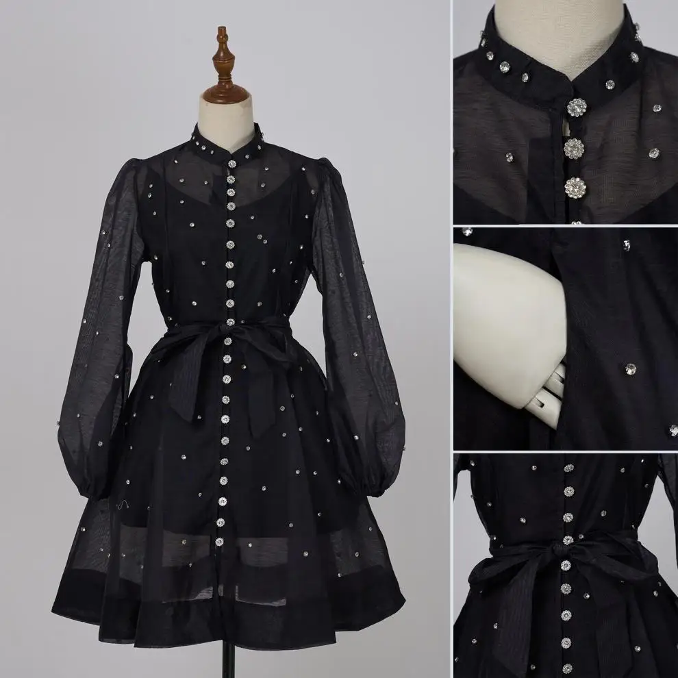 ZYHT 21938 Black Velvet Mini Dress Square Neck Long Puff Sleeves with Pearl Trim & Crystal Dess Flared Scalloped Hem Dresses
