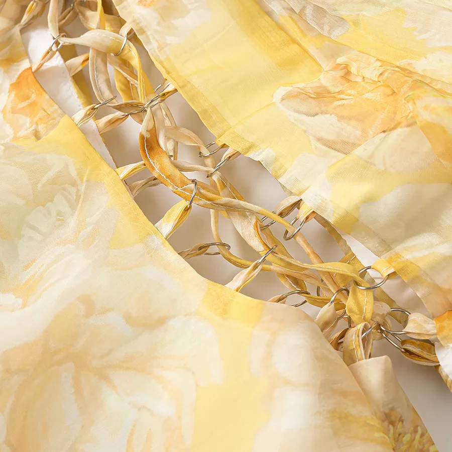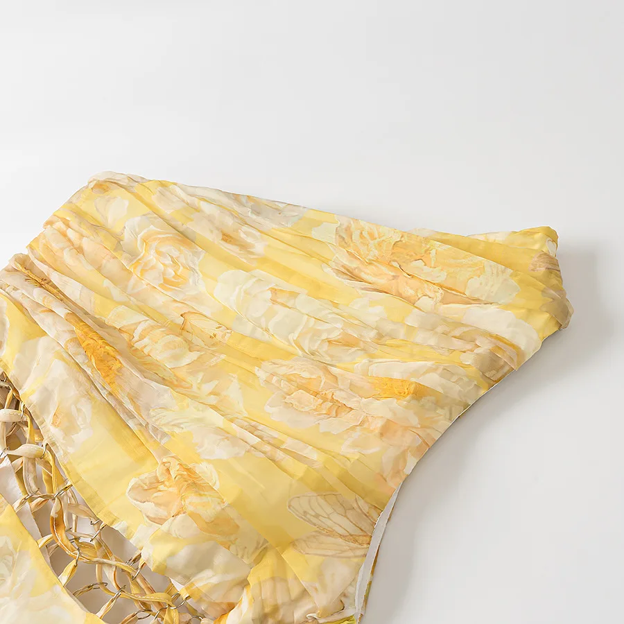 Sexy Sweet Spring Summer Slant Shoulder High Waist Dress Vacation Single Shoulder Pleated Lace-up Hollow Print Puffy Cake Trendy