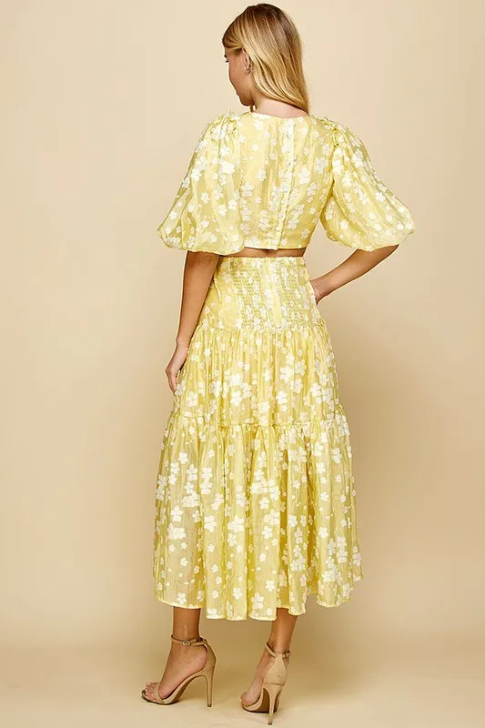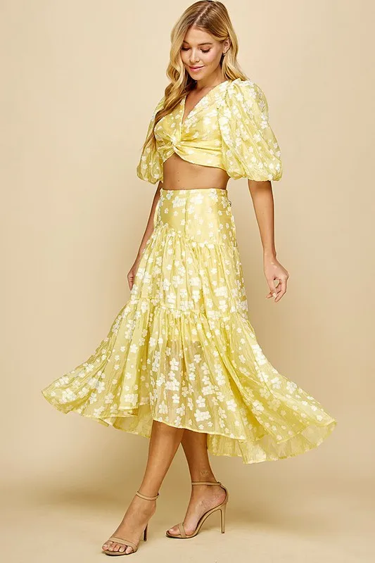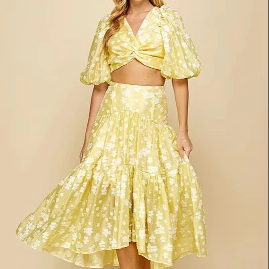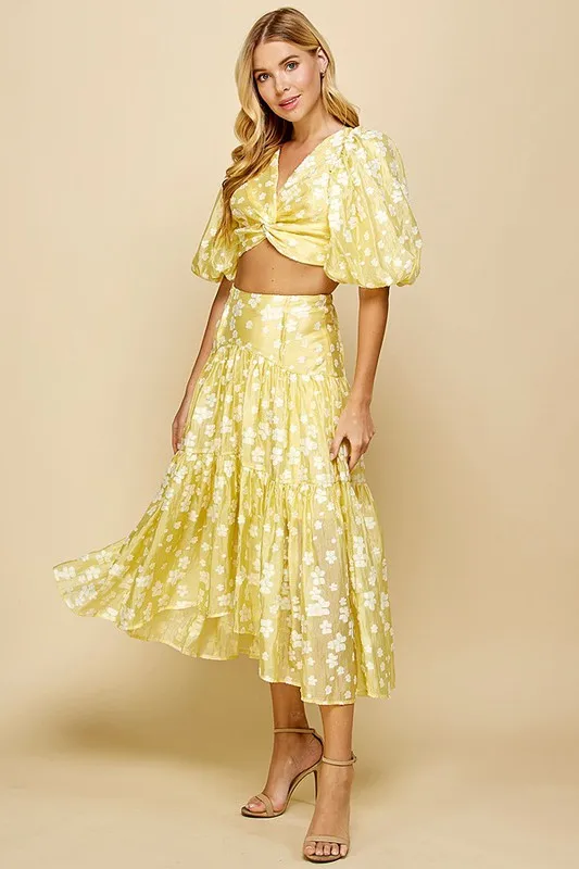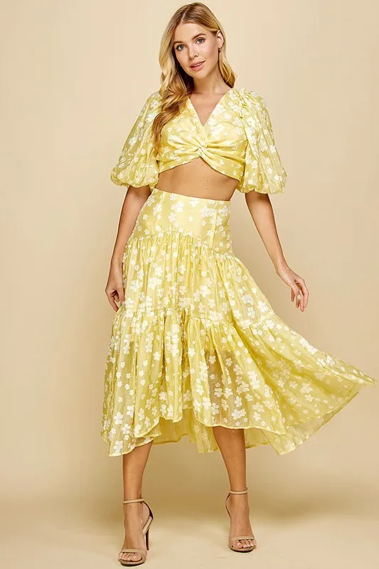 Unisex Retro Floral Two-piece Set Yellow Twist Top + Skinny Tiered Skirt for Summer Vacation Photos/Island Trips